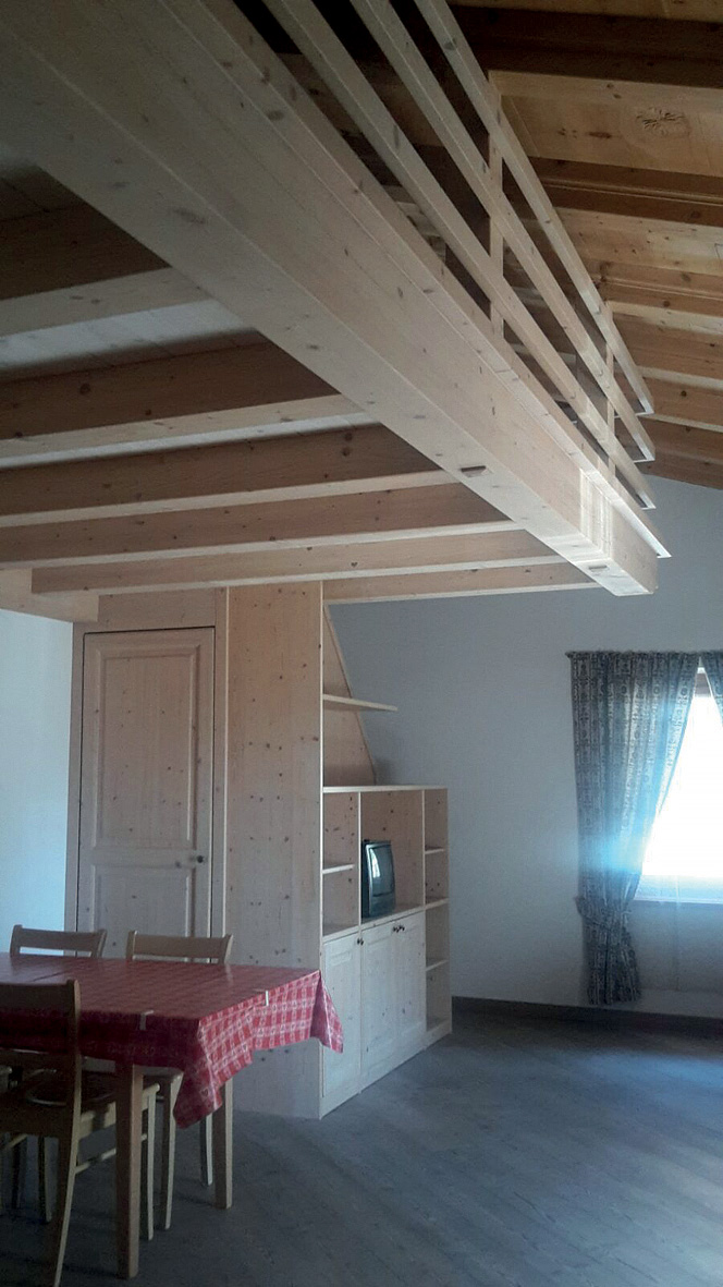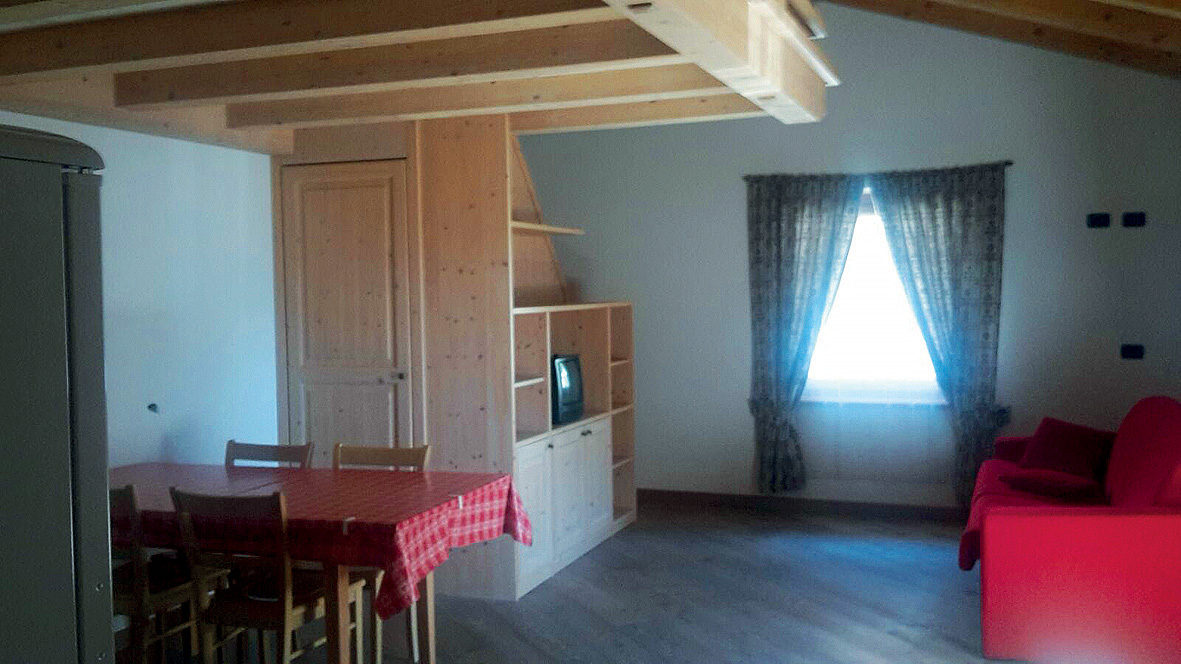 1 ložnice s manželskou postelí, 1 ložnice s palandou, obývací pokoj s kuchyňským koutem a rozkládacím gaučem pro 2 osoby, neuzavřené zvýšené patro v rámci obývacího pokoje se 2 samostatnými lůžky, sociální zařízení, balkon; přestože je k dispozici 8 lůžek, maximální obsaditelnost je 7 osob