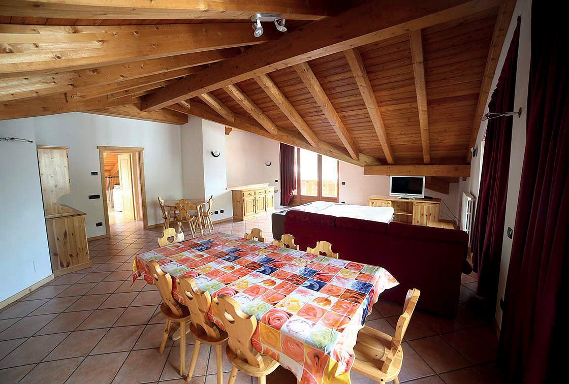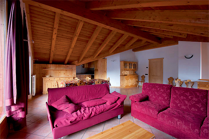 trilo 7 - 1 ložnice s manželskou postelí a 1 samostatným lůžkem, ložnice se 2 samostatnými lůžky, obývací pokoj s kuchyňským koutem a rozkládacím gaučem pro 2 osoby (trilo 7 velmi prostorný obývací pokoj), 2x sociální zařízení (1x se sprchou, 1x se sprchou a vanou), 2x balkon; apartmán se nachází v podkroví