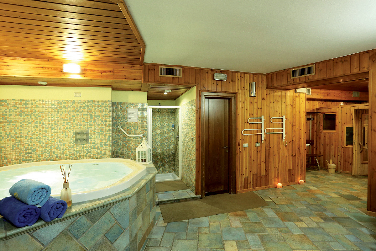 vířivka# až pro 4 osoby, sauna#, pára#, multifunkční sprcha#, relaxační koutek# s lehátky; služby označené # mohou využívat jen osoby od 14 let