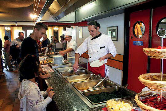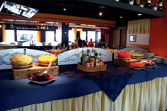 formou bufetu s výběrem ze 2 či 3 teplých předkrmů a 2 či 3 hlavních jídel s přílohou, salátový bufet, dezert, nápoje za poplatek
