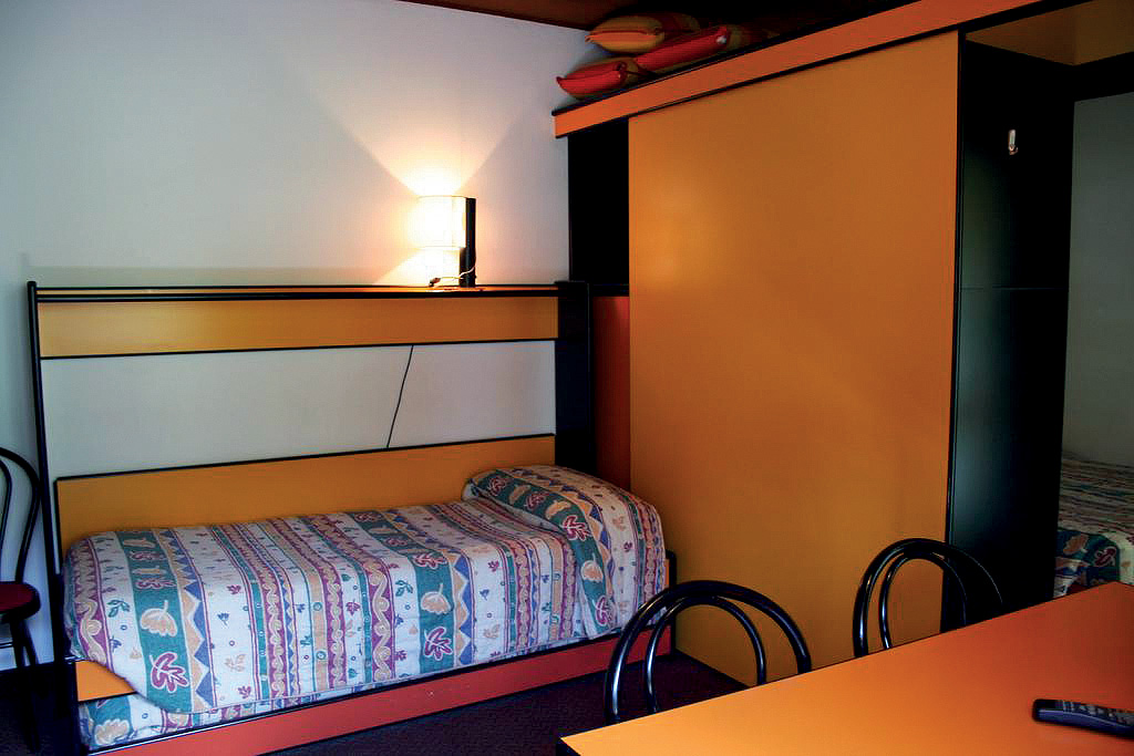 pokoj s manželskou postelí oddělený od obývacího pokoje nábytkovou stěnou se zašupovacími dveřmi, obývací pokoj s rozkládacím gaučem typu "šuplík" pro 1 či 2 osoby, sociální zařízení, zpravidla balkon