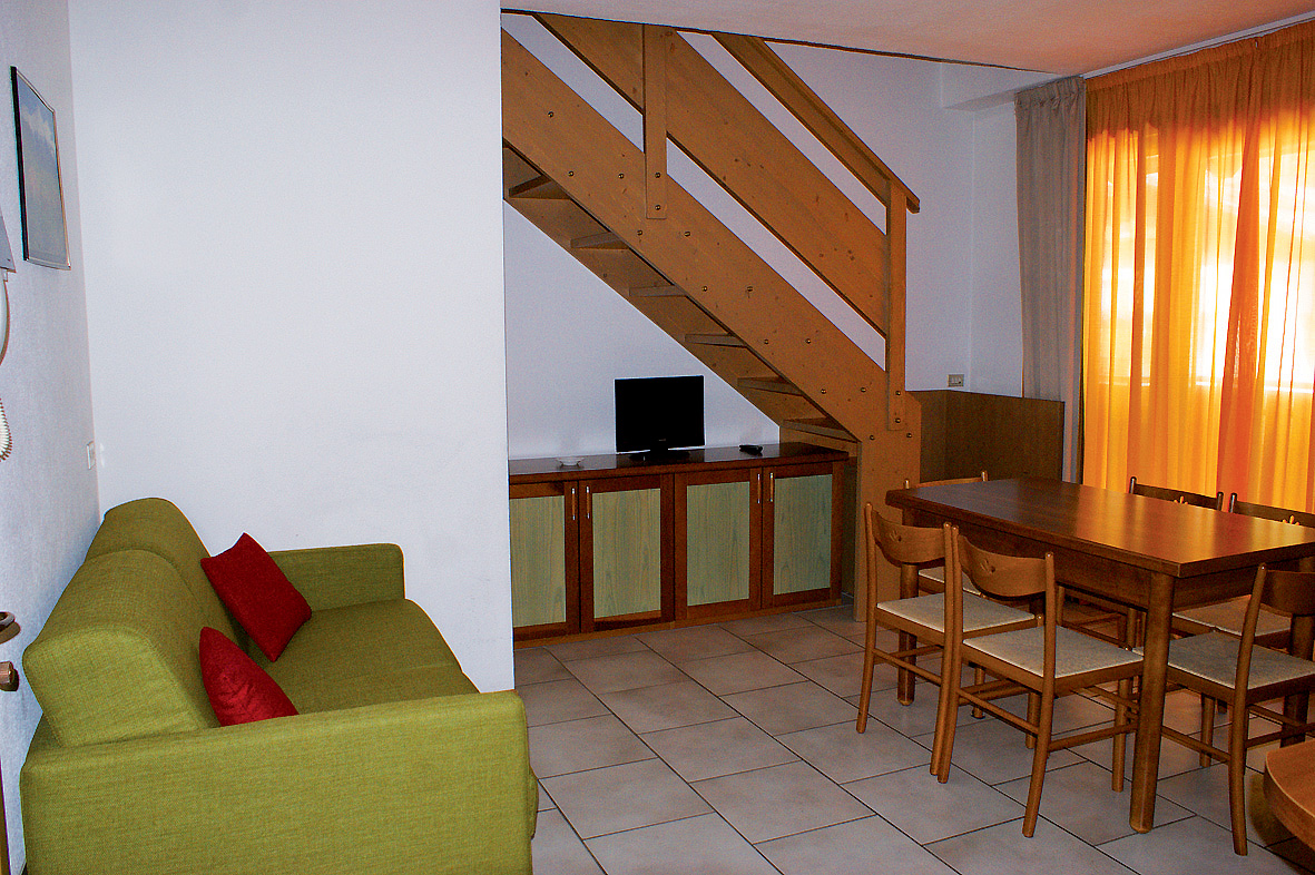 trilo 7 - 57 m² - 1. podlaží apartmánu: obývací pokoj s kuchyňským koutem a rozkládacím gaučem pro 2 osoby, sociální zařízení, balkon; 2. podlaží apartmánu: průchozí ložnice s manželskou postelí či 2 samostatnými lůžky, 1 ložnice s manželskou postelí a 1 samostatným lůžkem