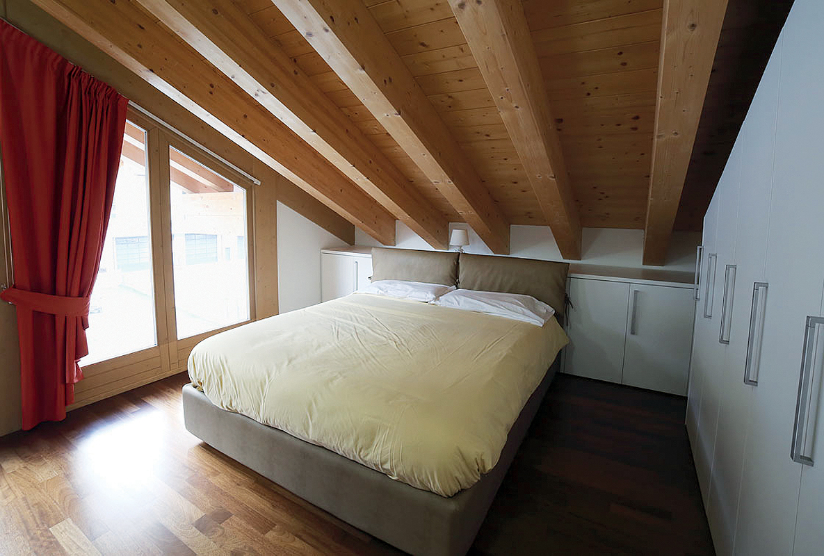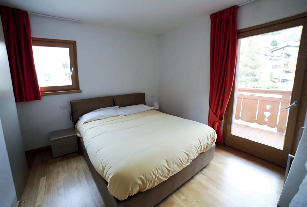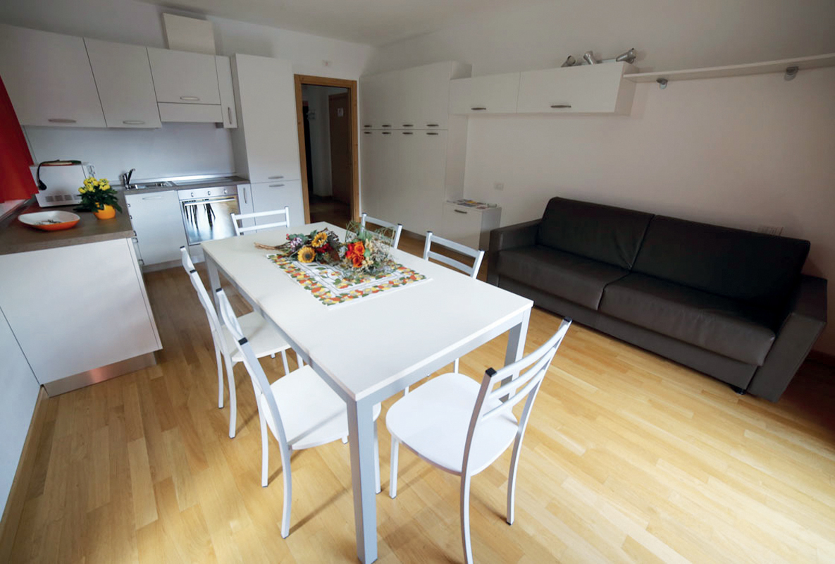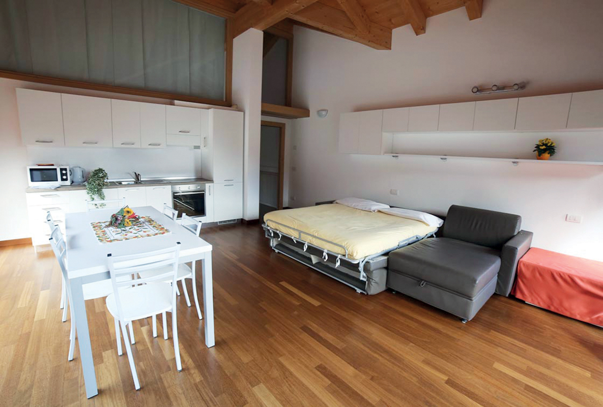 1 ložnice s manželskou postelí, 1 ložnice se 2 samostatnými lůžky, prostorný obývací pokoj s kuchyňským koutem a rozkládacím gaučem pro 2 osoby, sociální zařízení, balkon; apartmány jsou situovány v podkroví