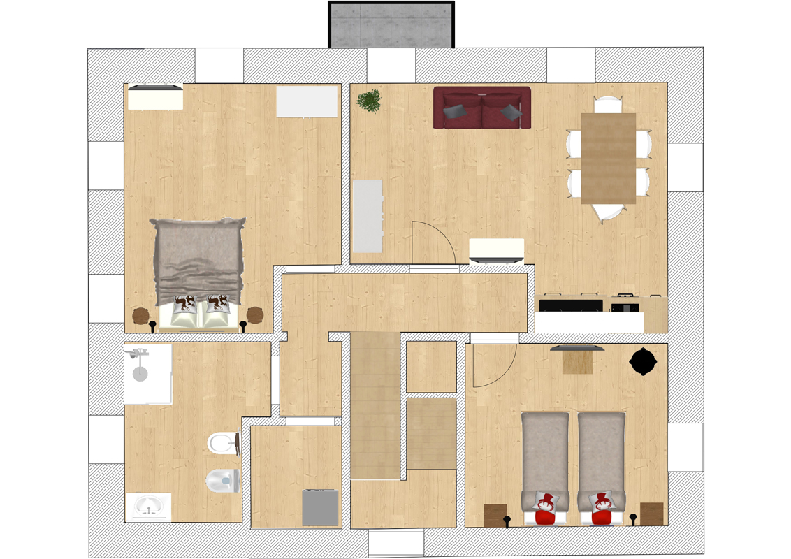 60 m² - 1 ložnice s manželskou postelí, obývací pokoj s kuchyňským koutem a rozkládacím gaučem pro 2 osoby, sociální zařízení; apartmán je situován v přízemí