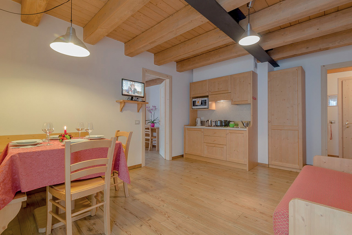 mono 4 - 33 až 44 m² - obývací pokoj s kuchyňským koutem, skříňovou manželskou postelí a palandou či 2 samostatnými lůžky (u některých apartmánů v částečně oddělené místnosti), sociální zařízení, zpravidla balkon