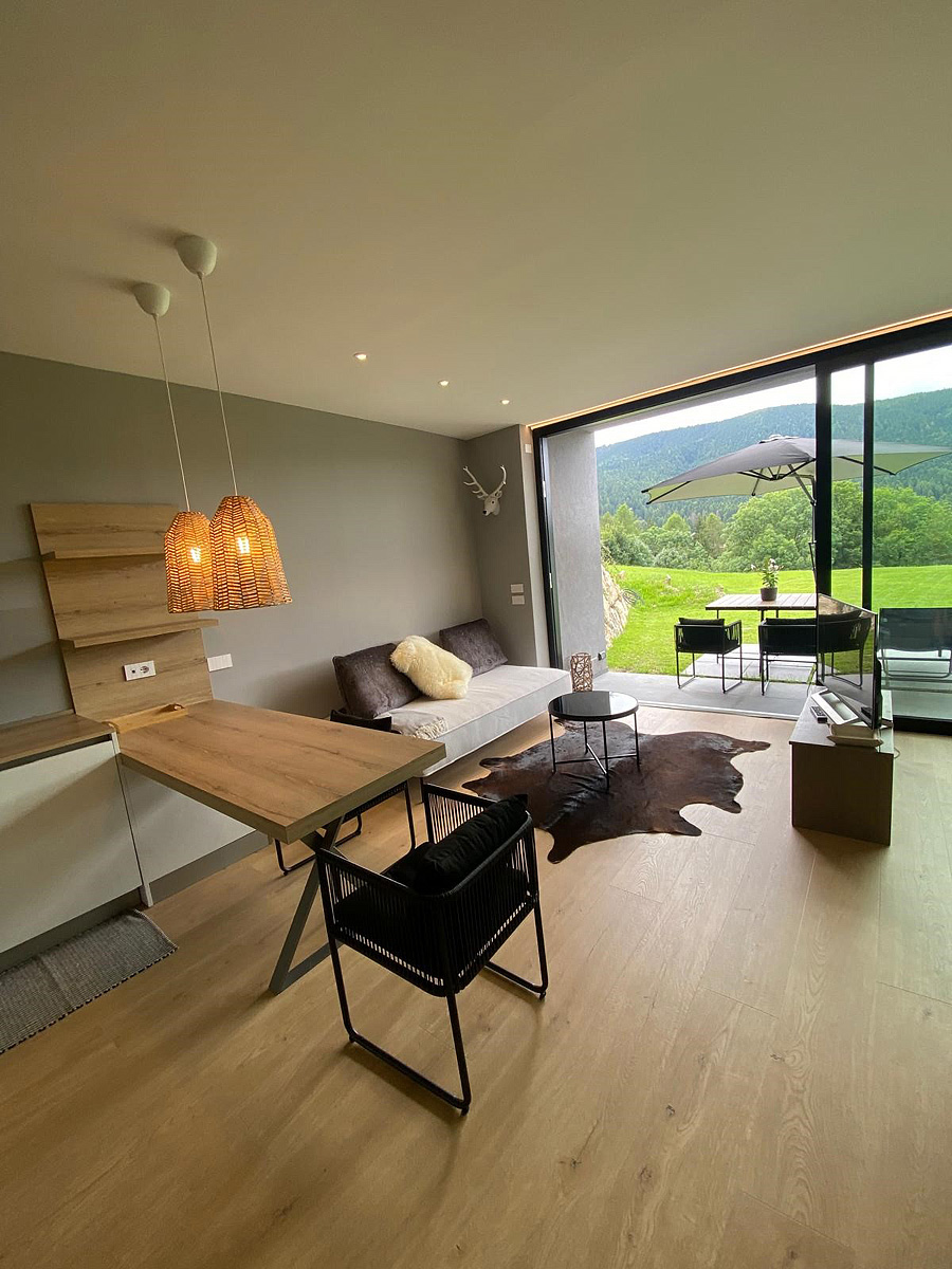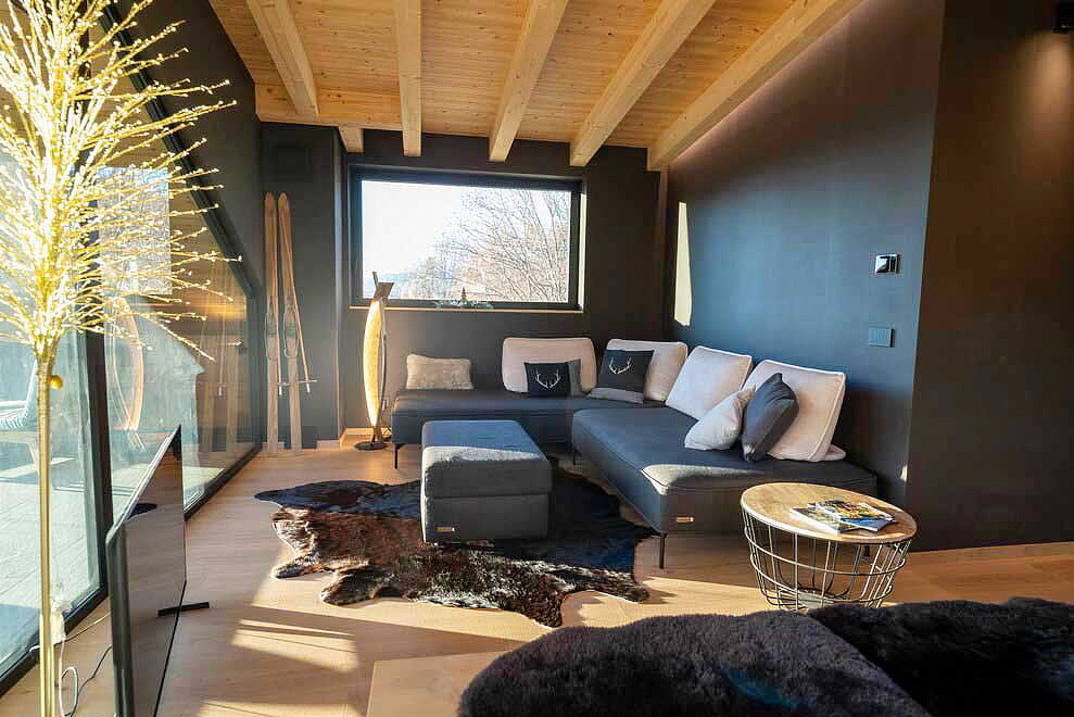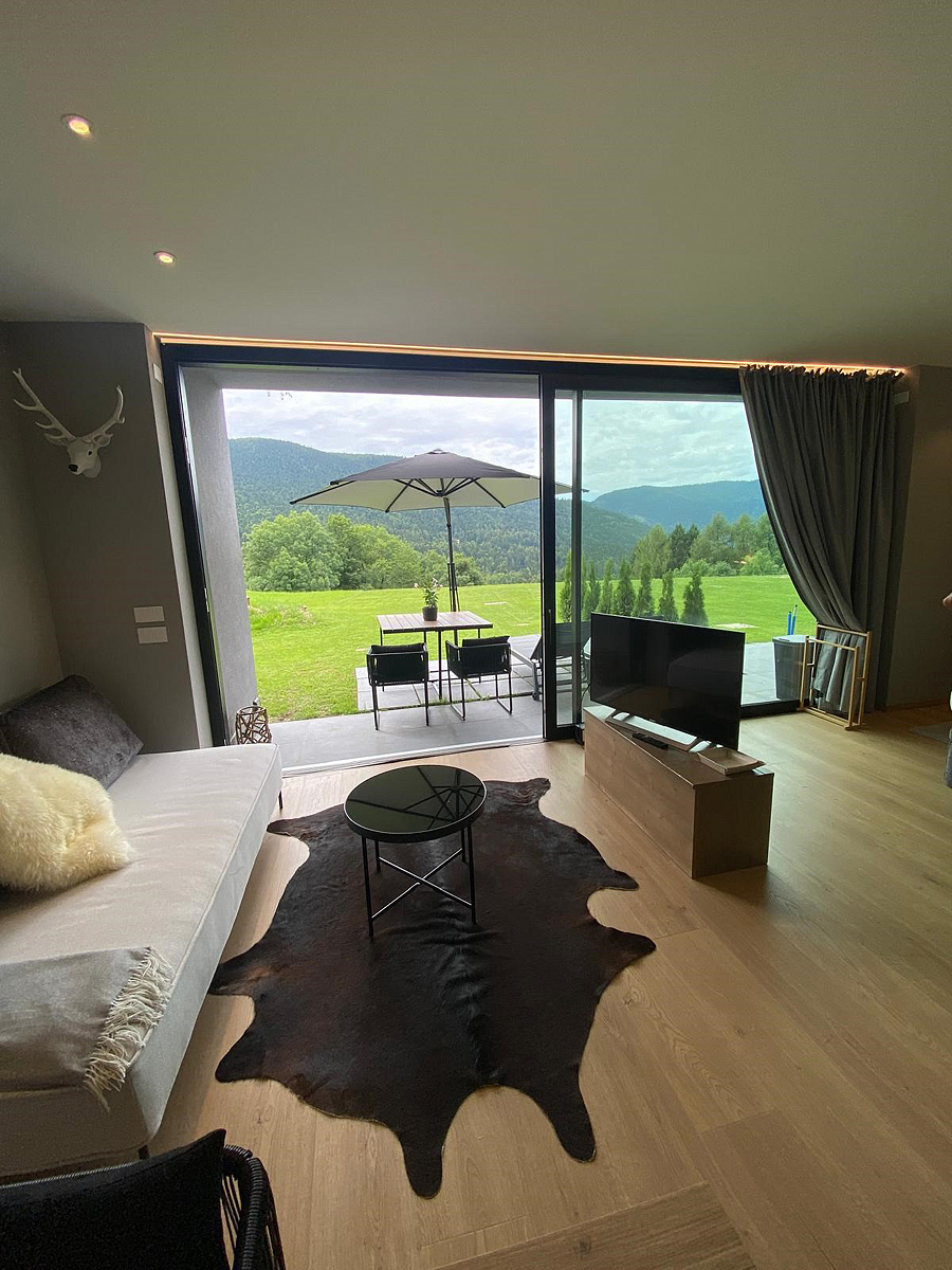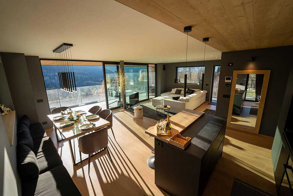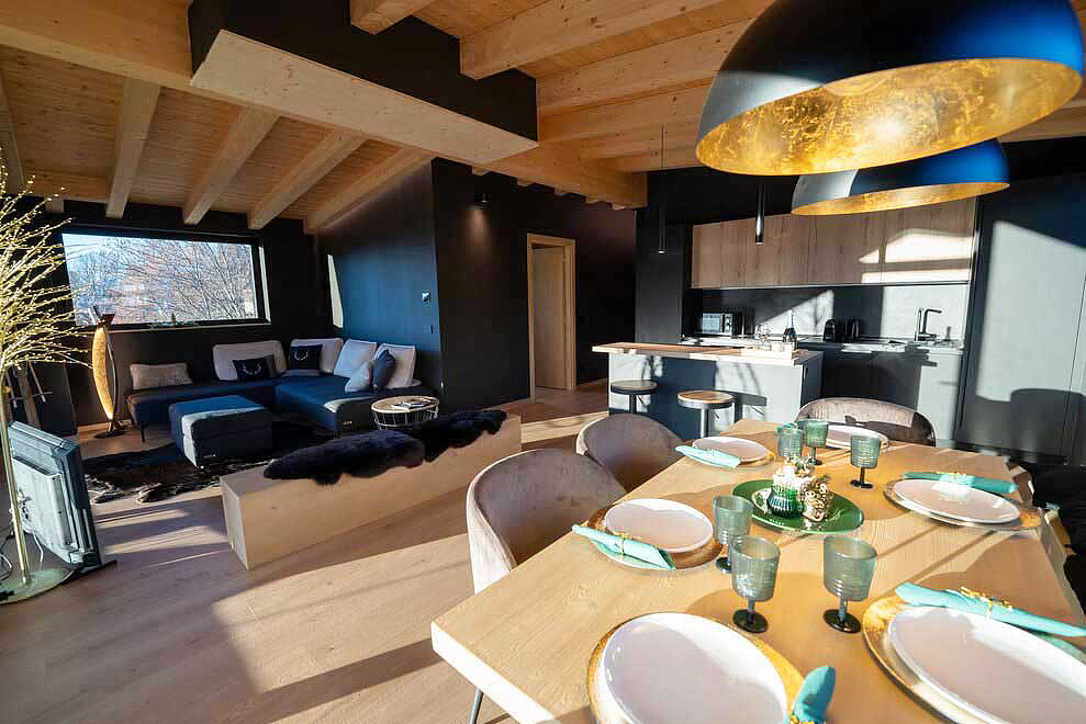 100 m² - 1. ložnice s manželskou postelí, 2. ložnice se 2 samostatnými lůžky na způsob mimoúrovňové palandy (o šířce lůžka 90 cm, pohodlná i pro dospělé), obývací pokoj s kuchyňským koutem a rozměrným sedacím prostorem, 2 sociální zařízení zpravidla se sprchou (1 přináležející k manželské ložnici), velká terasa s panoramatickým výhledem; maximální obsazenost apartmánu 5 dospělých a 1 dítě do nedovršených 14 let