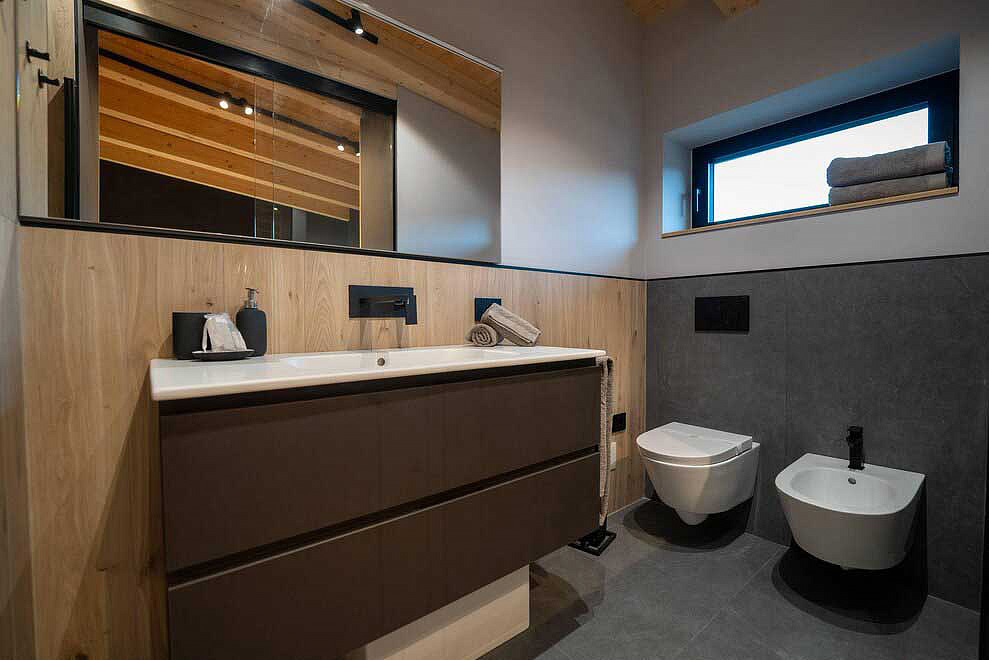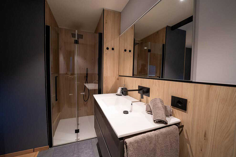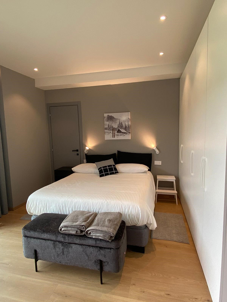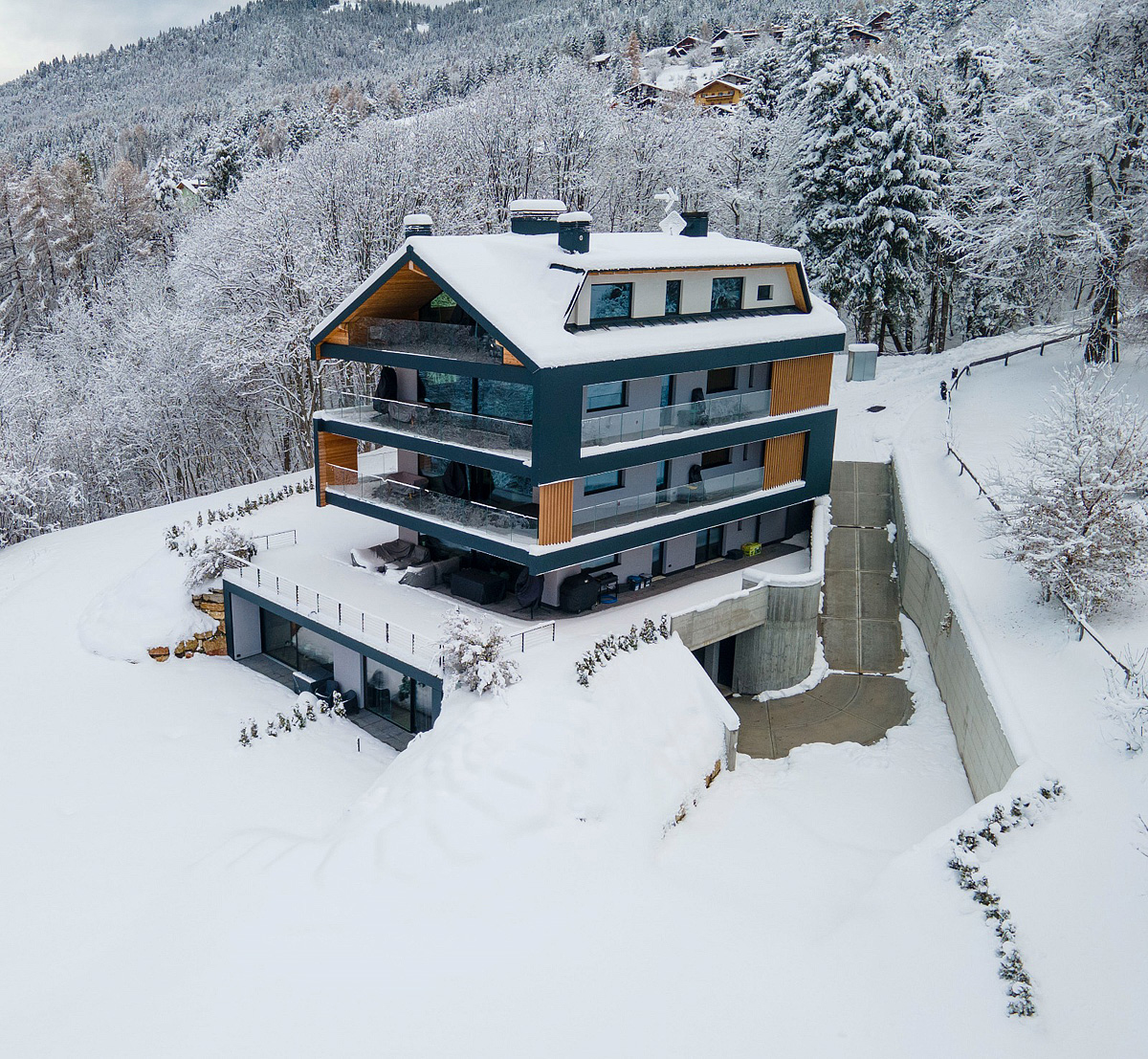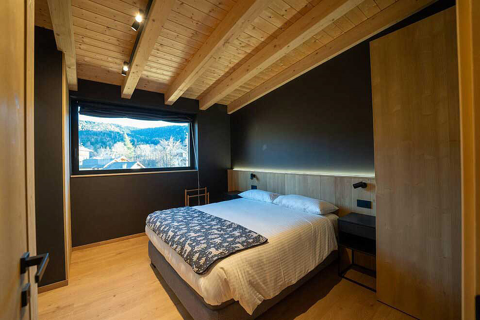 100 m² - 1. ložnice s manželskou postelí, 2. ložnice se 2 samostatnými lůžky na způsob mimoúrovňové palandy (o šířce lůžka 90 cm, pohodlná i pro dospělé), obývací pokoj s kuchyňským koutem a rozměrným sedacím prostorem, 2 sociální zařízení zpravidla se sprchou (1 přináležející k manželské ložnici), velká terasa s panoramatickým výhledem; maximální obsazenost apartmánu 5 dospělých a 1 dítě do nedovršených 14 let