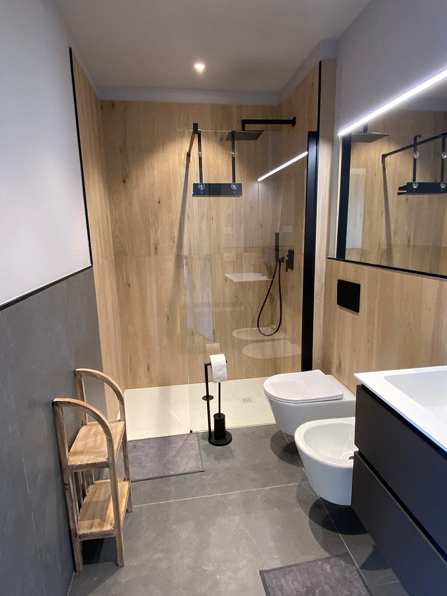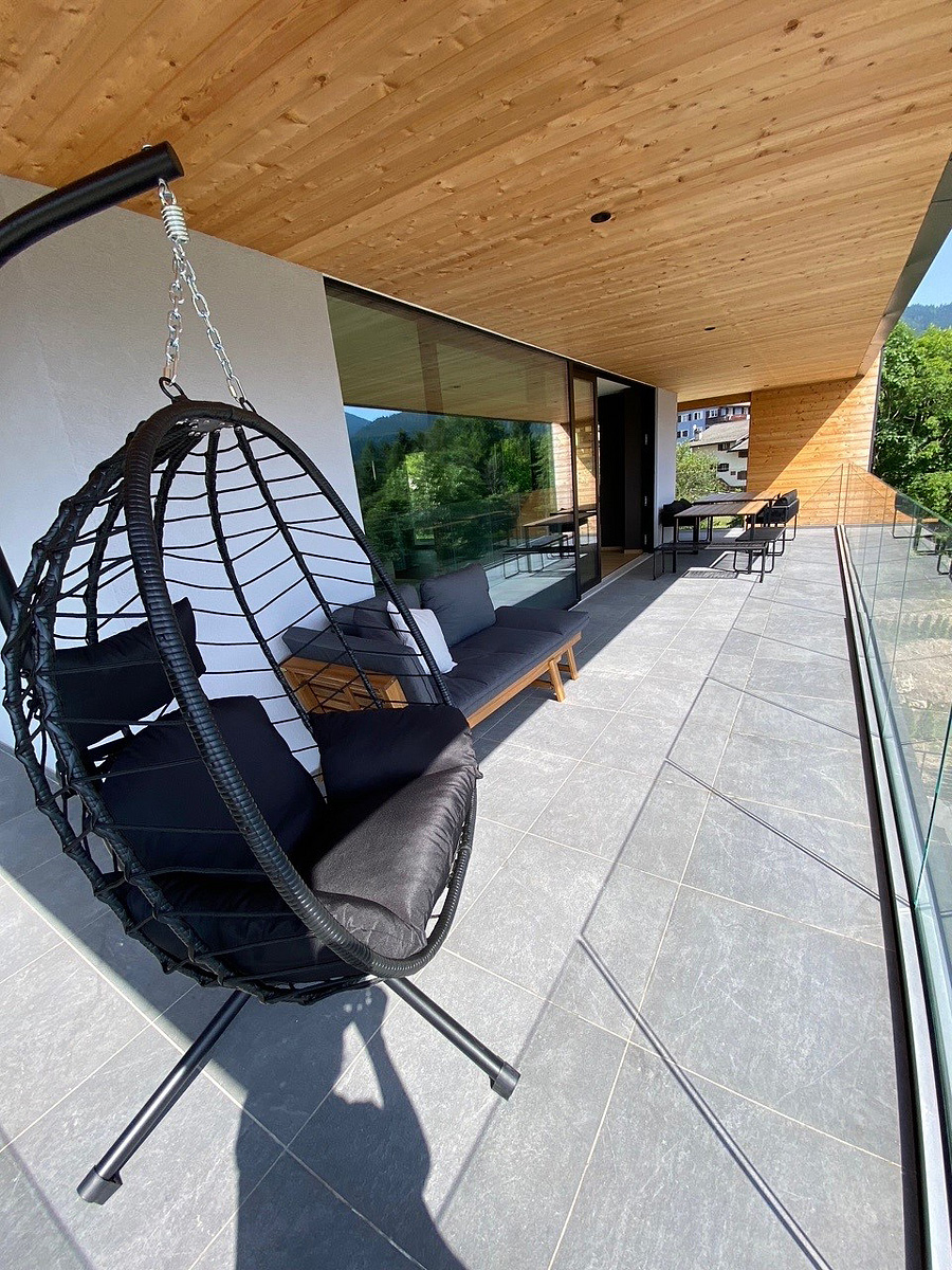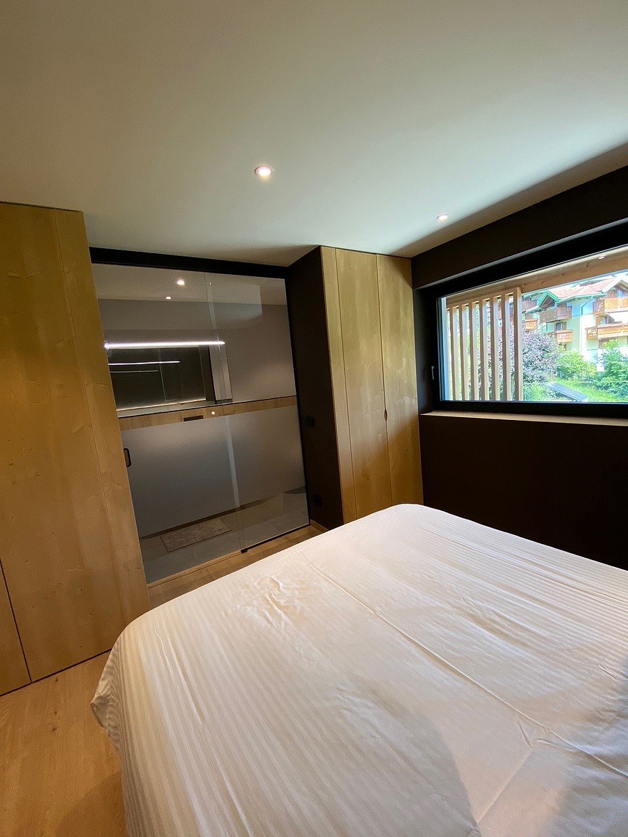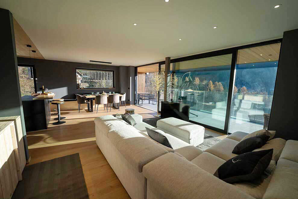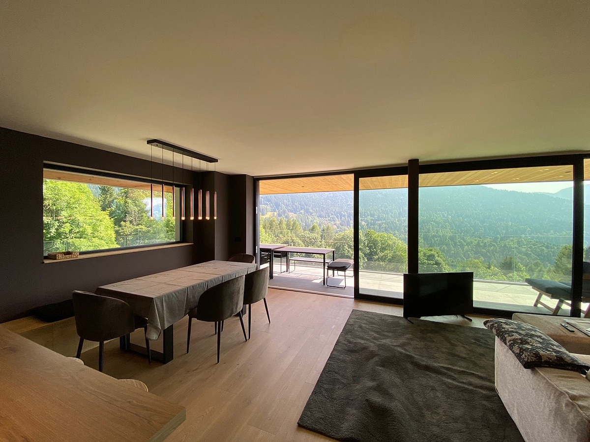 100 m² - 1. ložnice s manželskou postelí, 2. ložnice se 2 samostatnými lůžky na způsob mimoúrovňové palandy (o šířce lůžka 90 cm, pohodlná i pro dospělé), obývací pokoj s kuchyňským koutem a rozměrným sedacím prostorem, 2 sociální zařízení zpravidla se sprchou (1 přináležející k manželské ložnici), velká terasa s panoramatickým výhledem; maximální obsazenost apartmánu 5 dospělých a 1 dítě do nedovršených 14 let