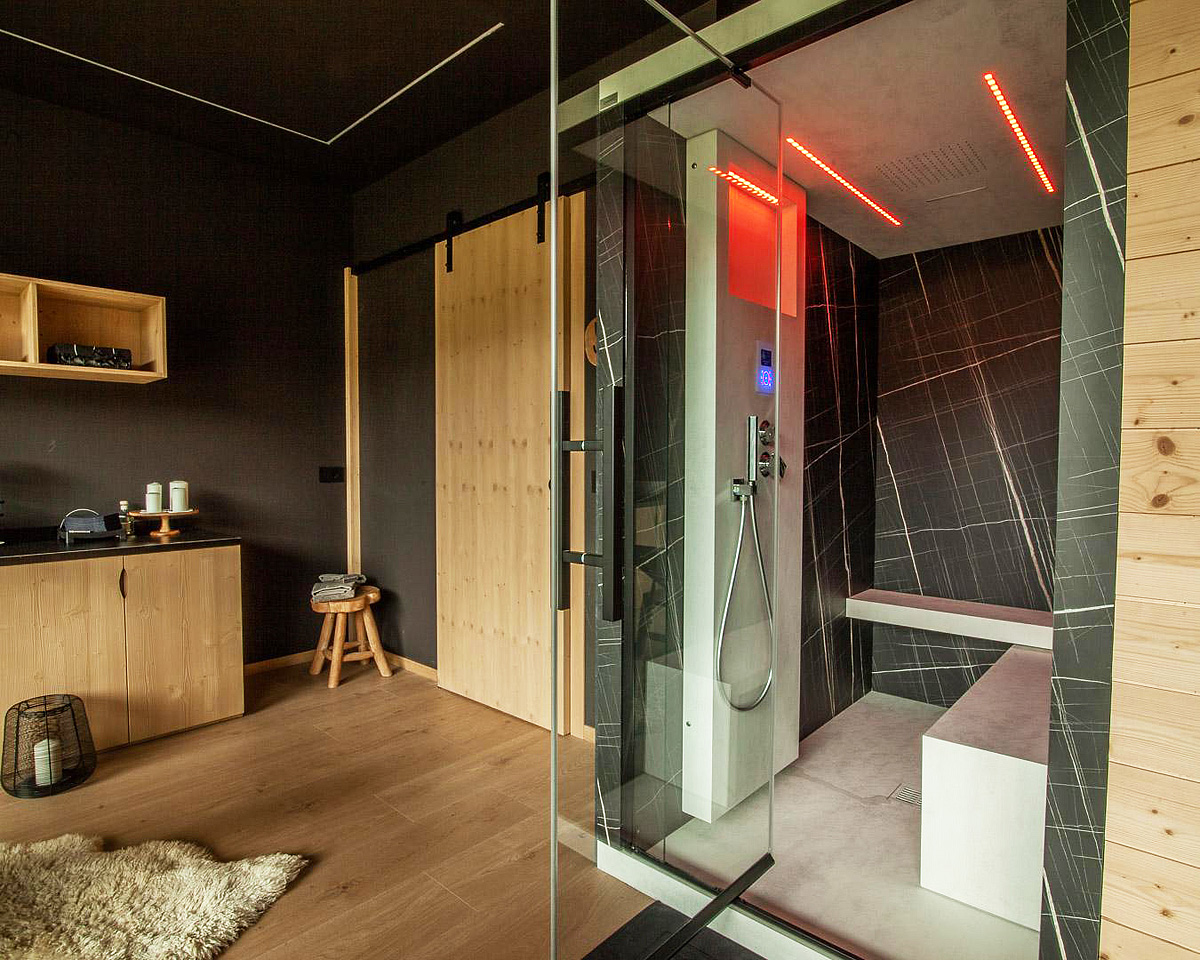 sauna*, parní lázeň se sprchou*, relaxační kout* s lehátky a bylinkovými čaji