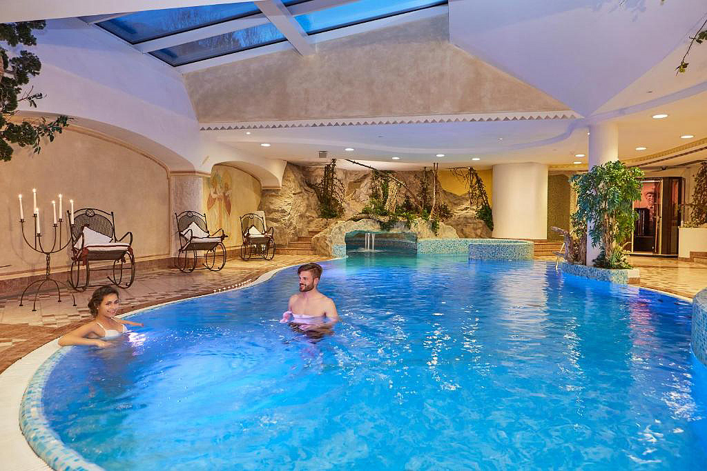 bazén nepravidelného tvaru s vířivkou, umělým vodopádem a protiproudem, finská sauna#, venkovní panoramatická sauna#, pára#, tepidárium#, infrakabina#, 2x relaxační koutek s lehátky#, Kneippův chodník#, posilovna#; služby označené # mohou děti využívat jen v doprovodu dospělé osoby; v rámci relaxačního centra jsou zdarma nabízeny též bylinkové čaje, ovocné šťávy, pramenitá voda, malé sladké dezerty, zákusky a čerstvé ovoce