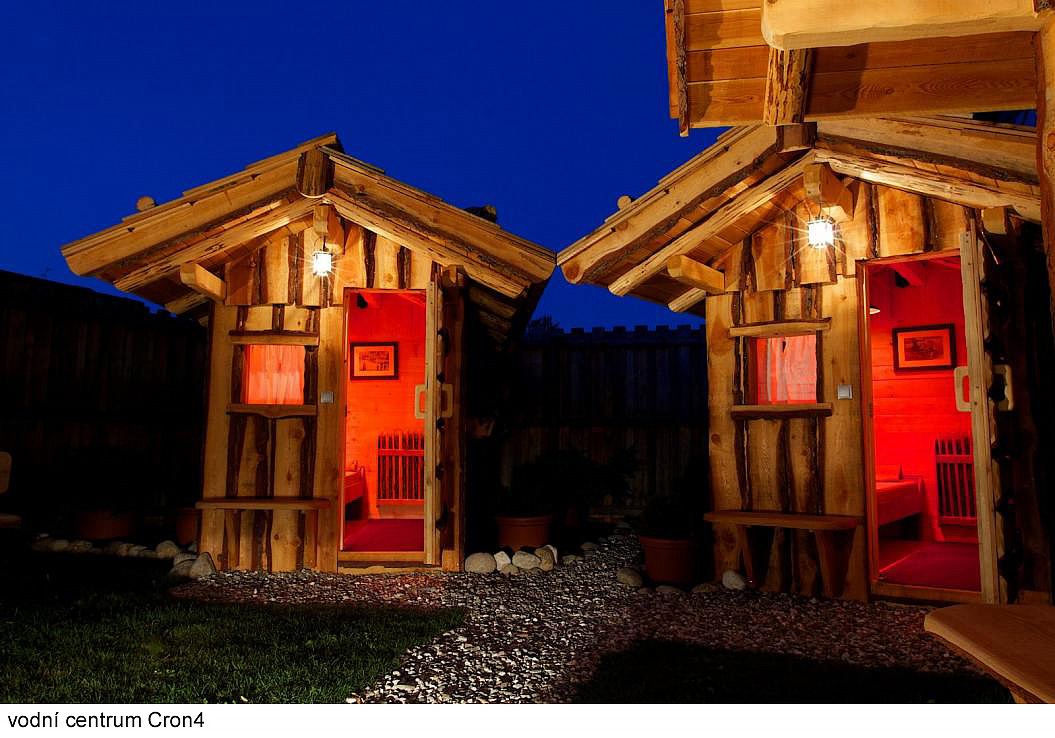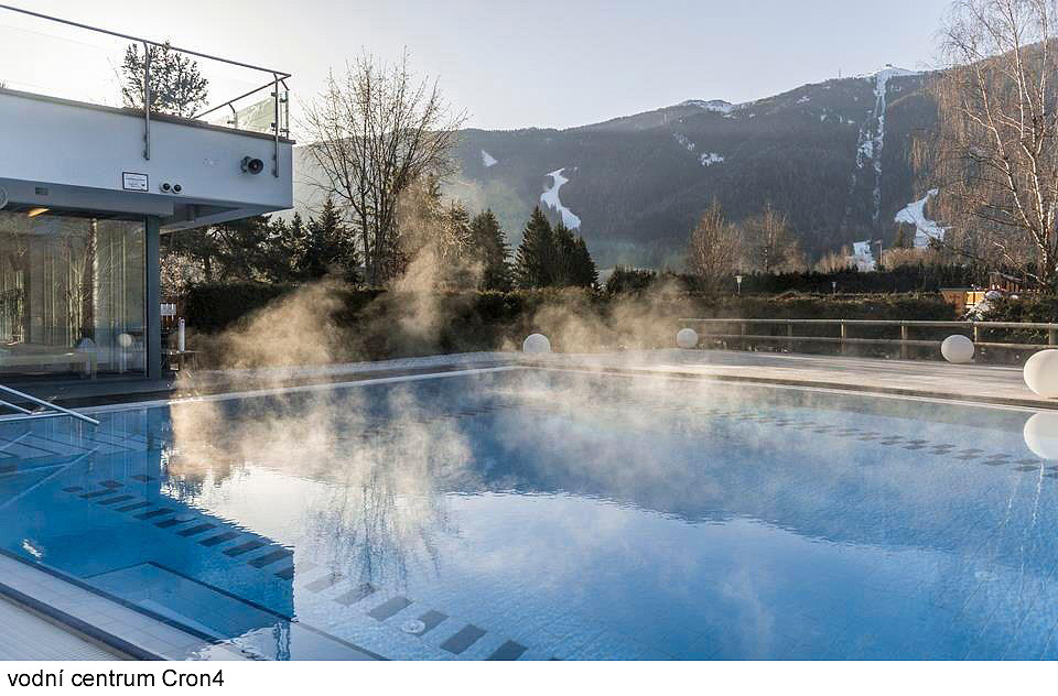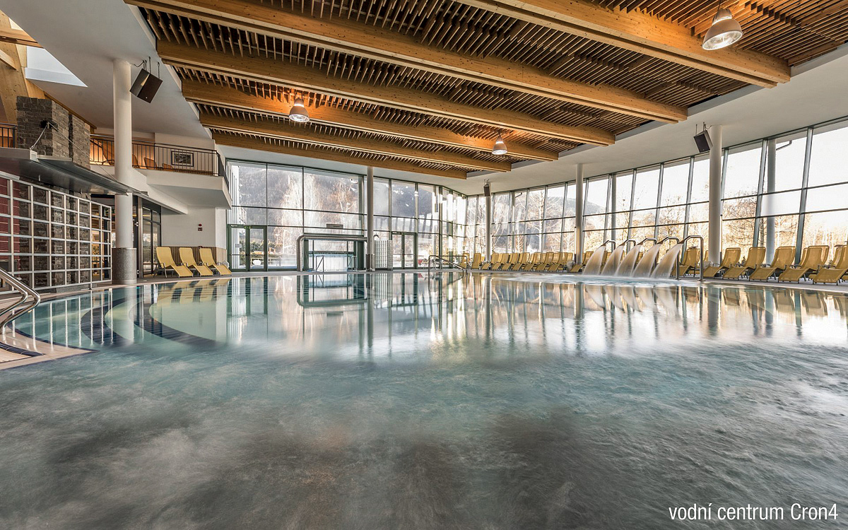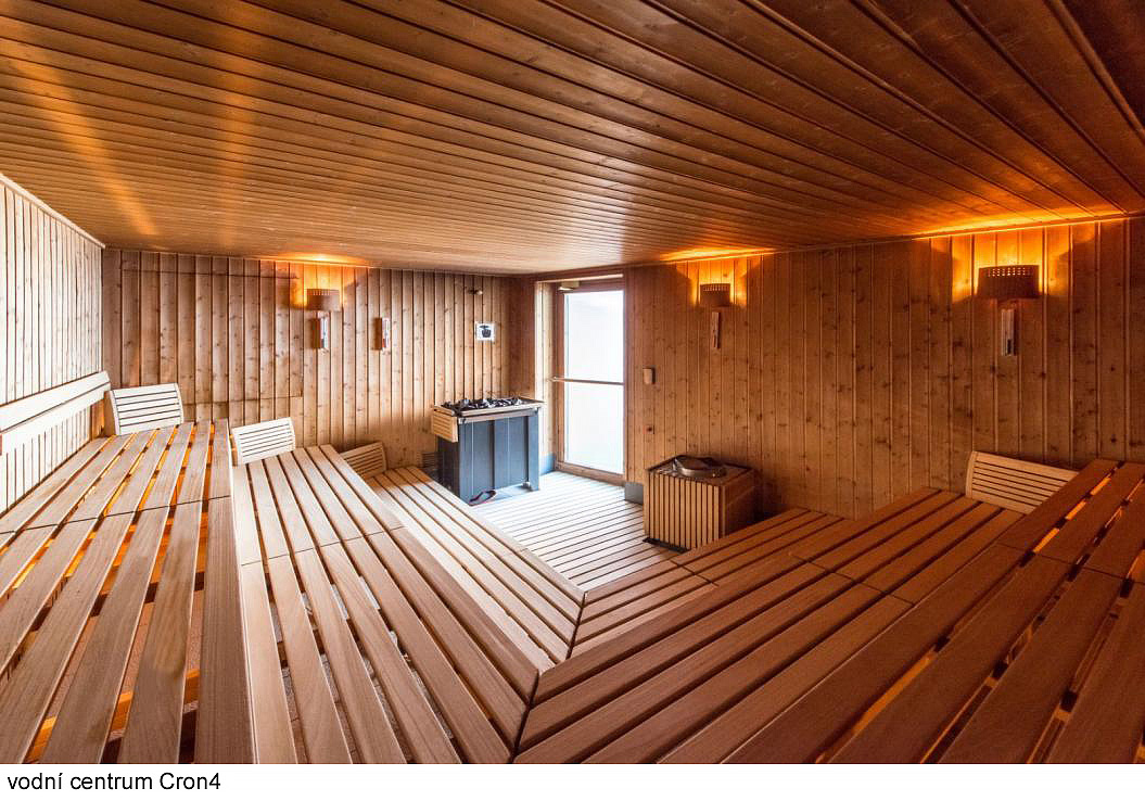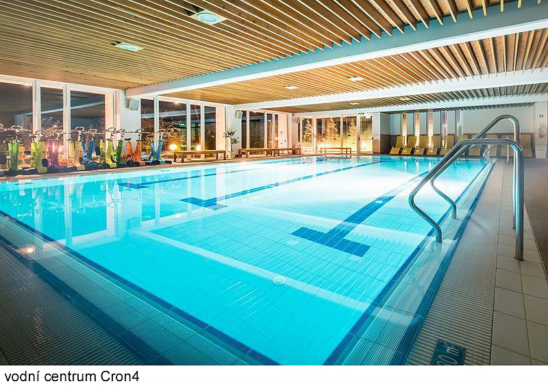 panoramatická sauna#, infrakabina#, 2x relaxační koutek s lehátky#, posilovna#; vodní centrum Cron4 - bazén 25 x 12 m, dětský bazének, bazén 115 m² se slanou vodou, venkovní vyhřívaný bazén, 75 m dlouhý tobogán; služby označené # mohou využívat osoby od 16 let