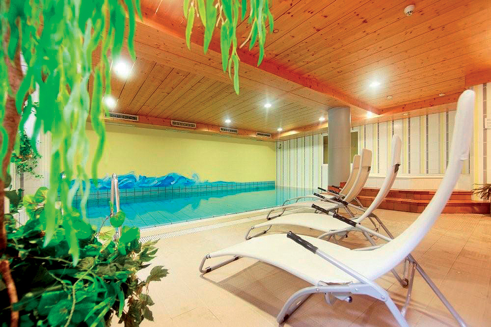 bazén 10 x 6 m, bazén 8 x 4 m, venkovní vyhřívaný bazén 20 x 6 m, vířivka až pro 6 osob, sauna#, venkovní sauna#, relaxační koutek s lehátky, 4 posilovací stroje, služby označené # mohou využívat jen osoby od 15 let