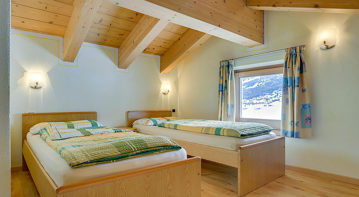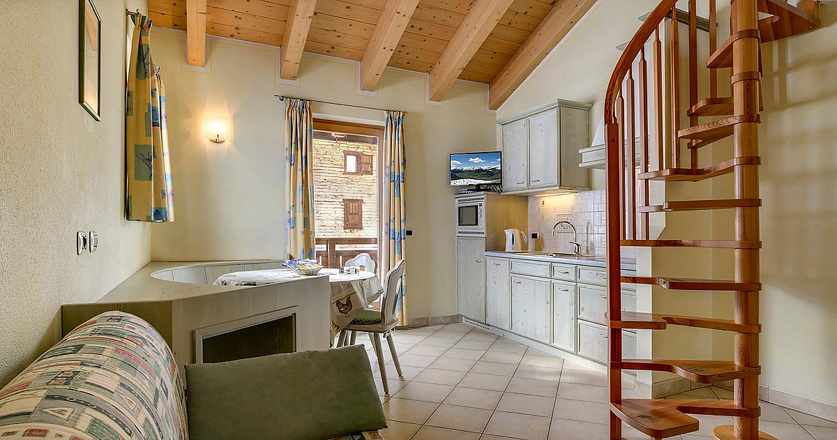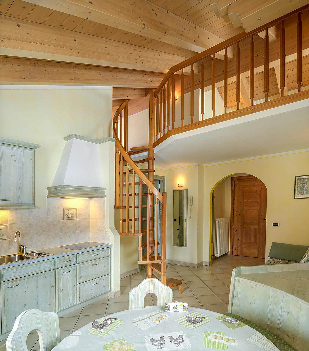 1. podlaží apartmánu - 1 ložnice s manželskou postelí a balkonem, 1 ložnice se 2 samostatnými lůžky a balkonem, obývací pokoj s kuchyňským koutem a balkonem, sociální zařízení zpravidla se sprchou a vanou; 2. podlaží apartmánu - neuzavřené podkroví se 2/3 lůžky