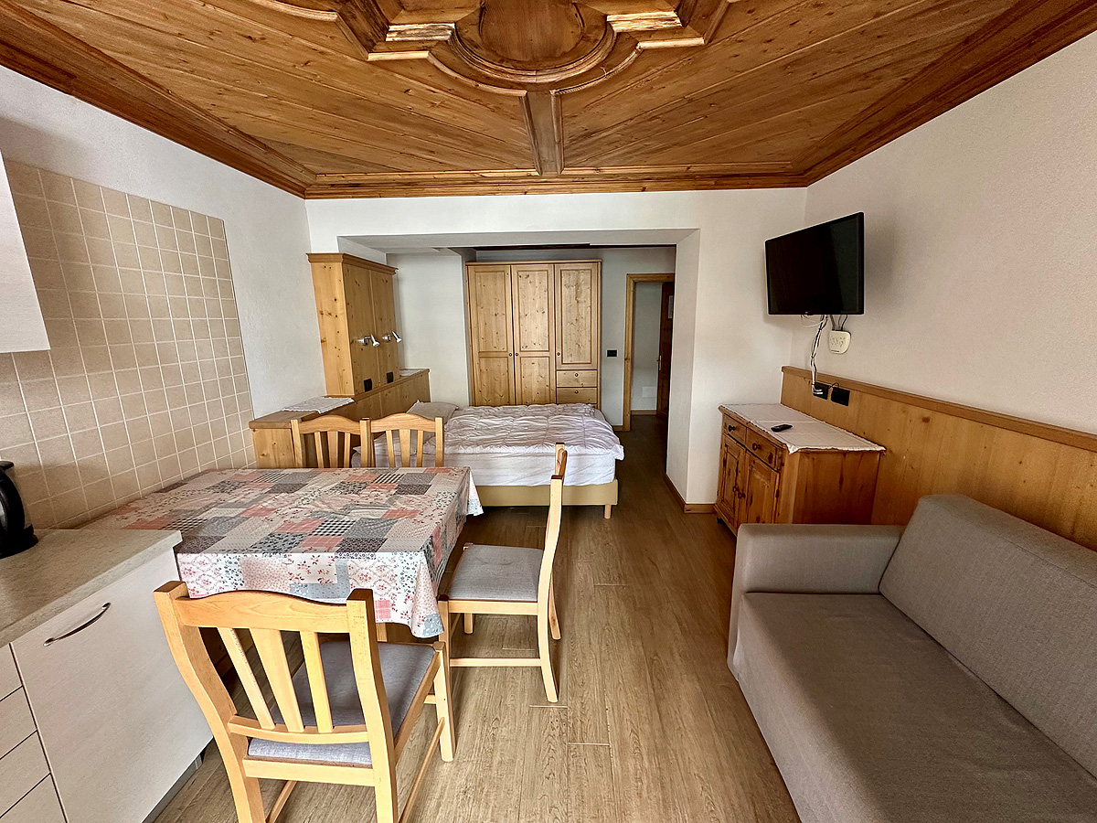 výhodná lyžařská poloha na jižním svahu Carosella a zároveň v blízkosti nákupních možností