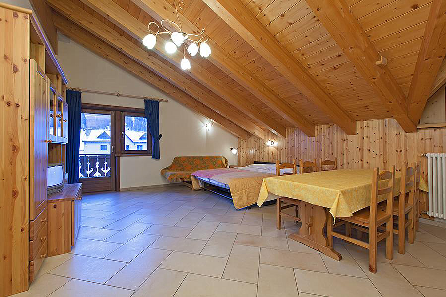 1 ložnice s manželskou postelí a jedním samostatným lůžkem, obývací pokoj s kuchyňským koutem a rozkládacím gaučem pro 2 osoby, sociální zařízení zpravidla se sprchou, balkon; apartmán je situován v podkroví