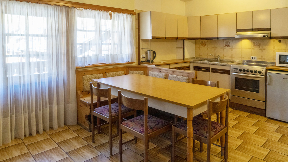 1 ložnice s manželskou postelí či 2 samostatnými lůžky, 1 ložnice se 2 samostatnými lůžky (možno spojit), obývací pokoj s kuchyňským koutem a rozkládacím gaučem pro 2 osoby, sociální zařízení se sprchou, balkon; apartmán se nachází v 1. patře