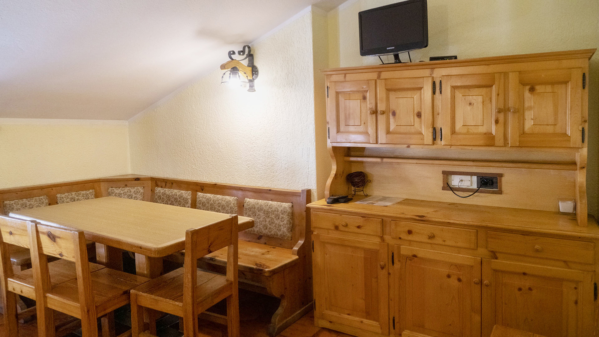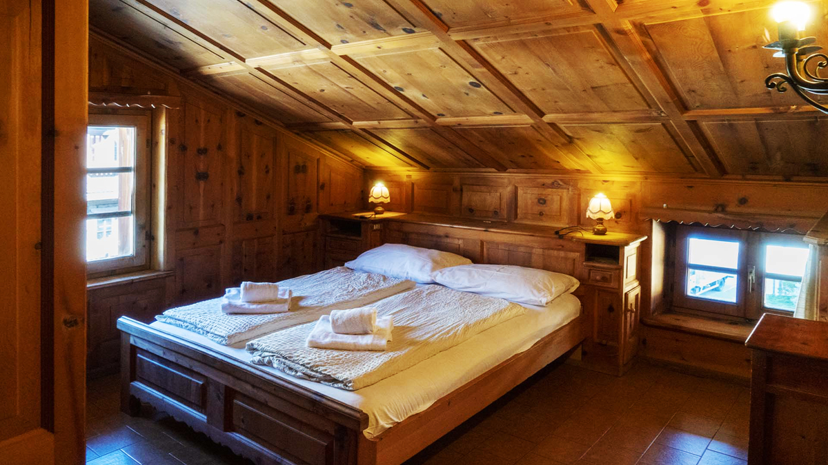 1 ložnice s manželskou postelí či 2 samostatnými lůžky a balkonem, 1 ložnice se 2 samostatnými lůžky (možno spojit), obývací pokoj s kuchyňským koutem, sociální zařízení se sprchou; apartmán je situován v podkroví