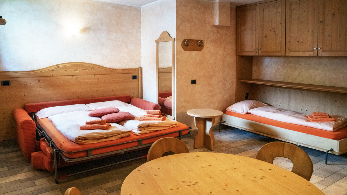 dvoupodlažní; 1. podlaží – obývací pokoj s kuchyňským koutem a rozkládacím gaučem pro 2 osoby, sociální zařízení se sprchou, malý balkon, 2. podlaží - 1 ložnice s manželskou postelí nebo 2 samostatnými lůžky, 1 ložnice se 2/3 samostatnými lůžky, sociální zařízení se sprchou; vchod do apartmánu v 1. patře