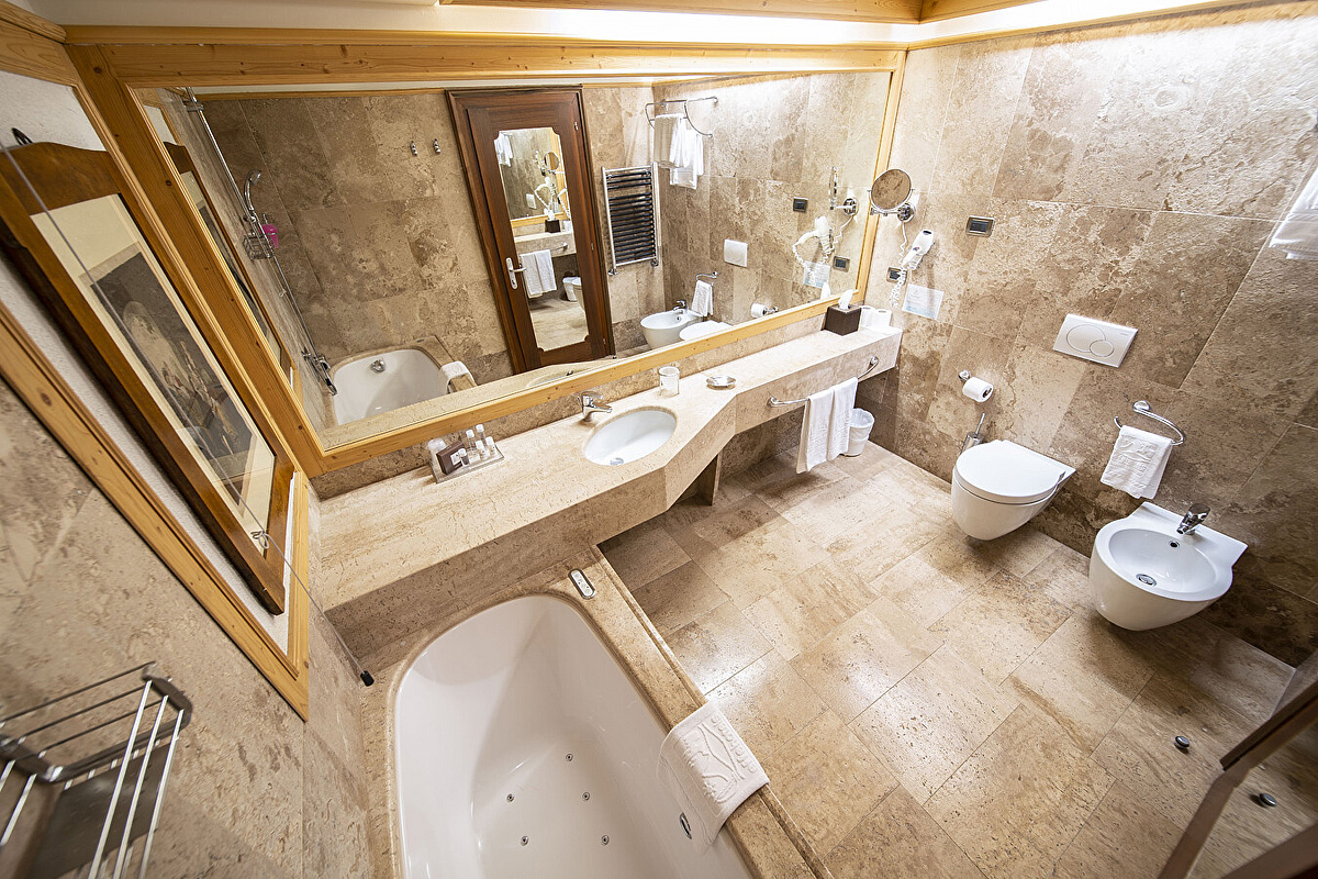TV sat., telefon, fén, trezor, wi-fi připojení k internetu, minibar*, župany do wellness, lahev vody při příjezdu, courtesy kit