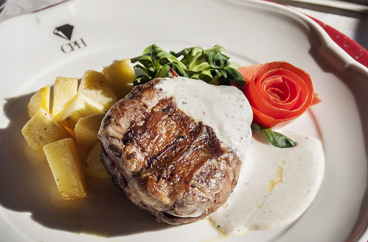 večeře - servírované menu s výběrem ze 3 teplých předkrmů, 3 hlavních jídel s přílohou, 3 až 4 dezertů, studené předkrmy a saláty formou bufetu, nápoje za poplatek