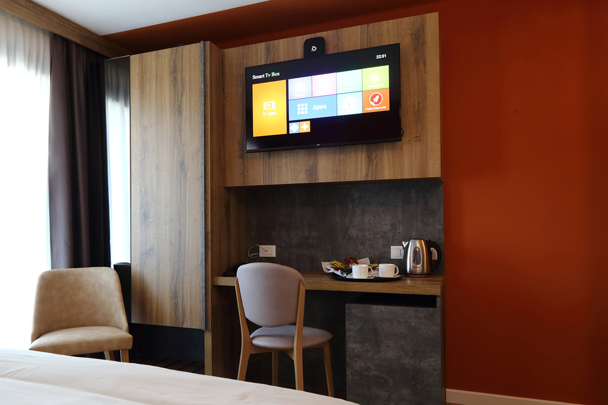 TV led, telefon, fén, trezor, wifi připojení k internetu, nápojová lednička