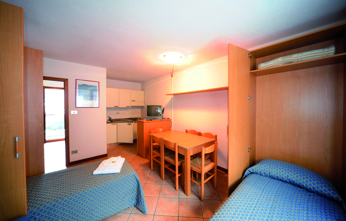 40 m² - 1 ložnice s manželskou postelí, obývací pokoj s kuchyňským koutem, 2 samostatnými či skříňovými lůžky a případně rozkládacím gaučem pro 1 osobu, sociální zařízení, společný balkon