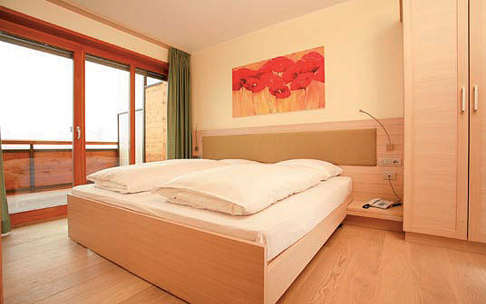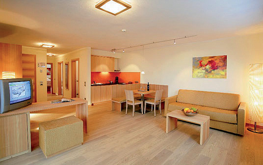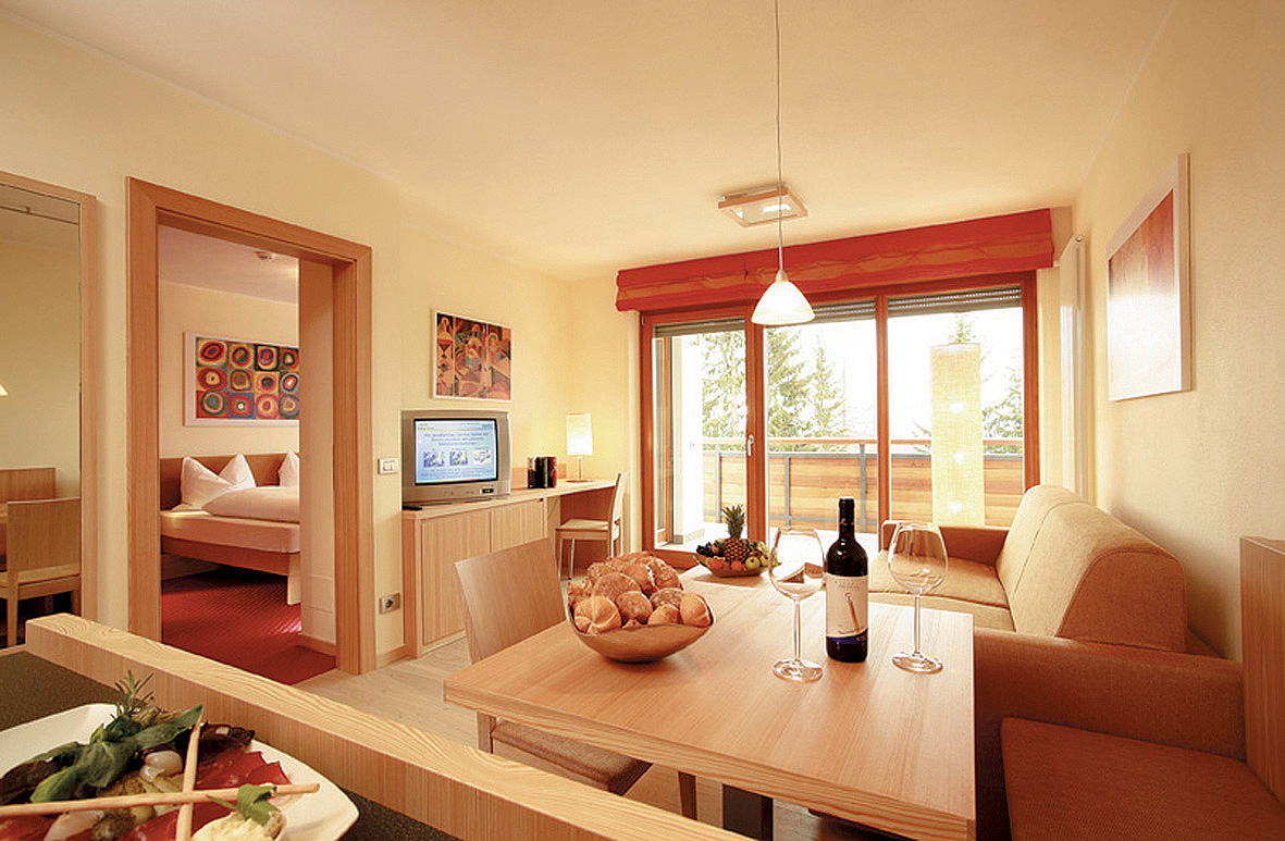 Junior Apartment Deluxe 4 - 43 až 47 m² - ložnice s manželskou postelí, obývací pokoj s kuchyňským koutem a rozkládacím gaučem pro 2 osoby, sociální zařízení se sprchou či vanou, balkon; některé pokoje mohou být dvoupodlažní