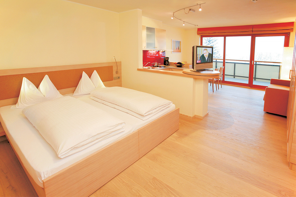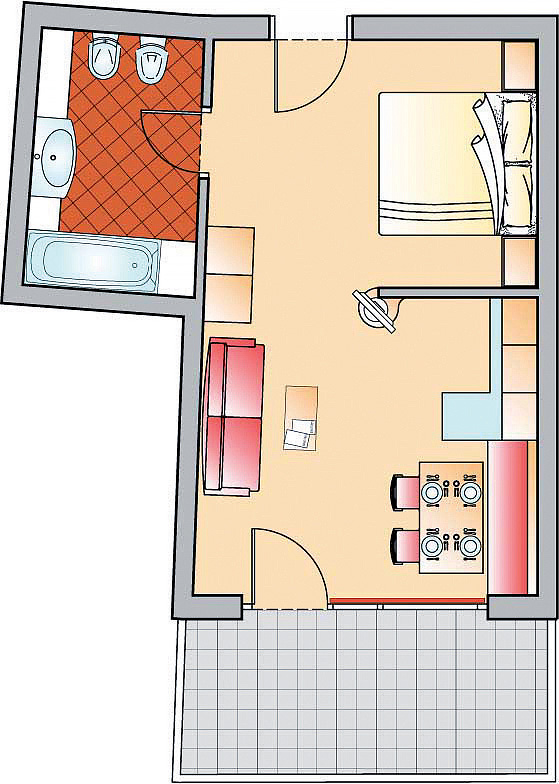 Junior Apartment 4 - 34 až 38 m² - pokoj s částečně odděleným kuchyňským koutem, manželskou postelí a rozkládacím gaučem pro 2 osoby, sociální zařízení se sprchou či vanou, balkon
