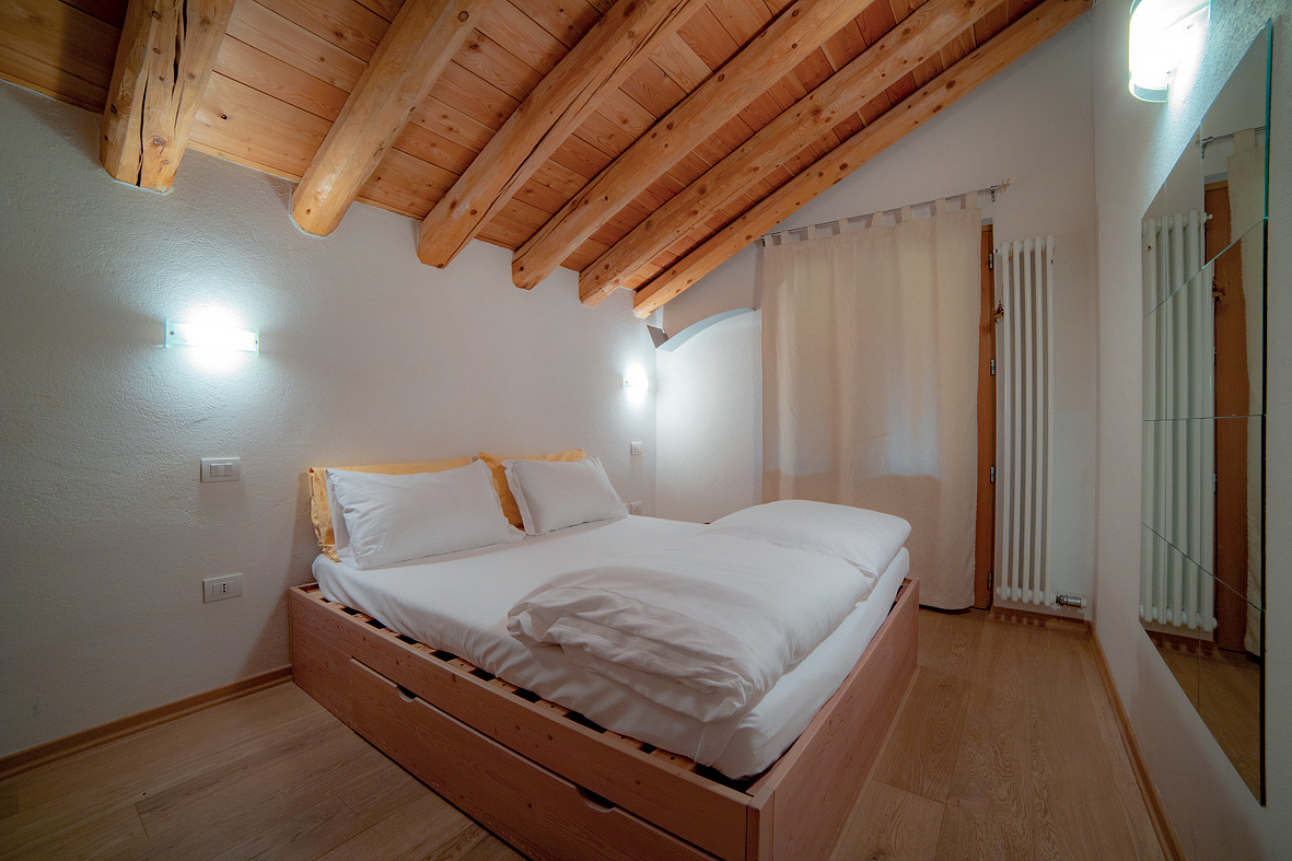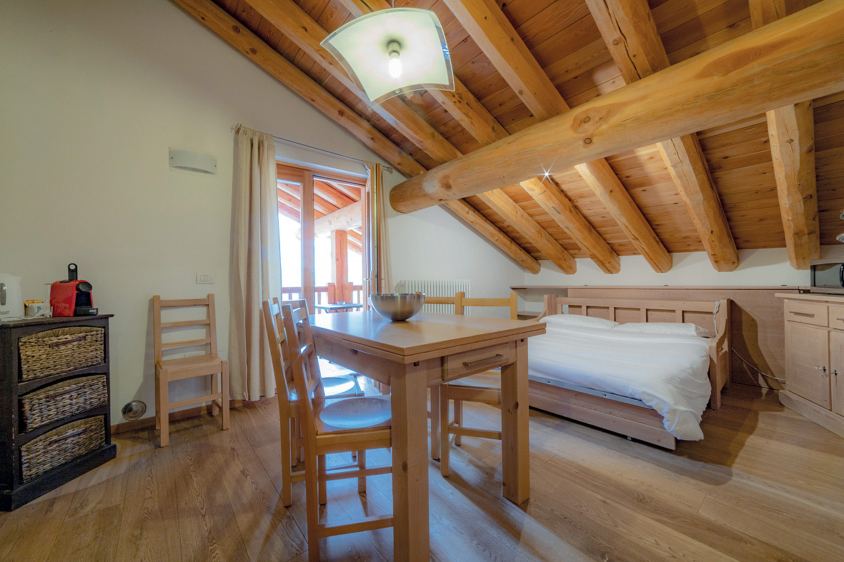 45 m² - 1 ložnice s manželskou postelí či 2 samostatnými lůžky, neuzavřené zvýšené patro s manželskou postelí či 2 samostatnými lůžky, obývací pokoj s kuchyňským koutem, sociální zařízení, balkon