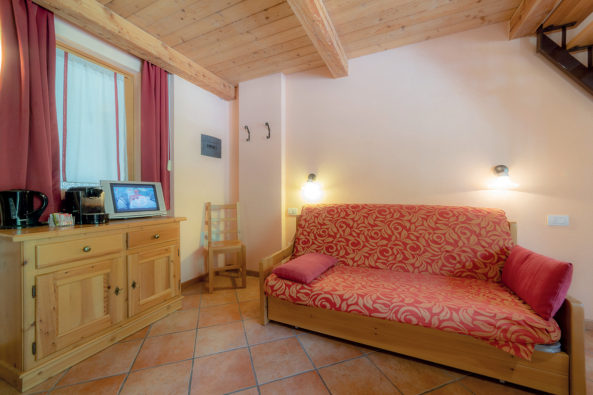 25 m² - obývací pokoj s kuchyňským koutem a rozkládacím gaučem pro 2 osoby, neuzavřené zvýšené patro v rámci obývacího pokoje s manželskou postelí či 2 samostatnými lůžky, sociální zařízení, balkon