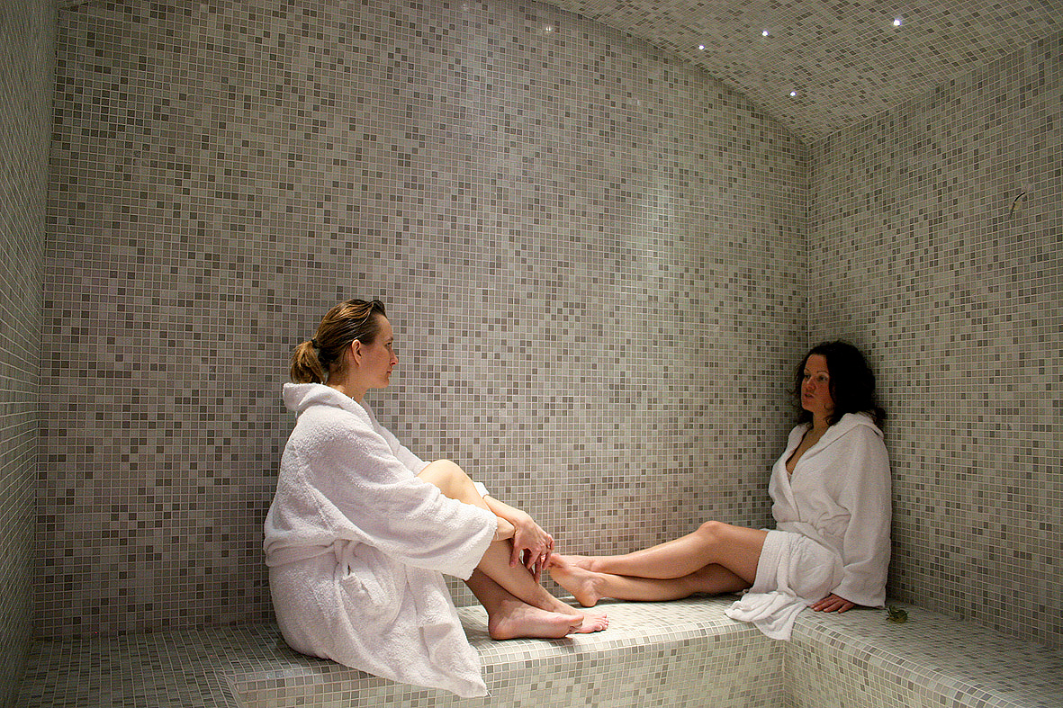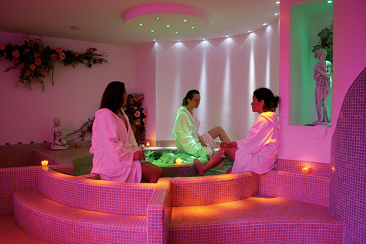 bazén 8 x 6 m s minibazénem, dětským bazénkem a vířivkou až pro 8 osob, sauna#, bio sauna#, pára#, ledová mlha#, multifunkční sprcha#, horizontální solárium#*, relaxační koutek# s lehátky, Kneippův chodník#, malá posilovna#, senná lázeň*, masáže*, kosmetické služby*, stolní tenis; služby označené # mohou využívat děti až od 16 let; povinná platba za zapůjčení osušky 5 € / výměna