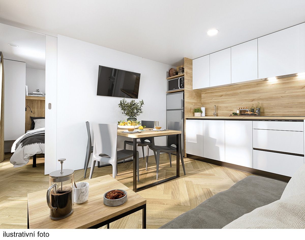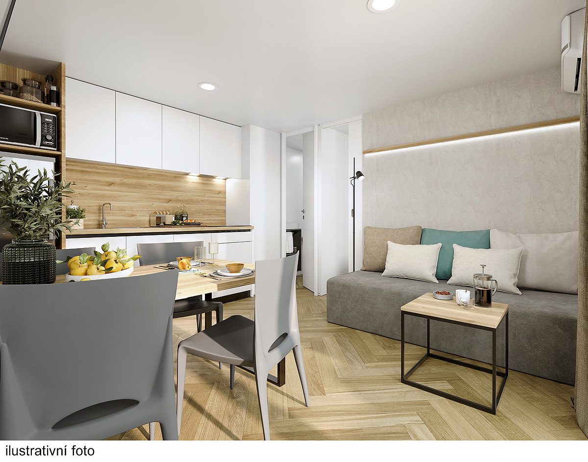 35 m² - 1 ložnice s manželskou postelí, 1 ložnice s palandou a případně 1 samostatným lůžkem, obytná kuchyň, sociální zařízení, terasa
