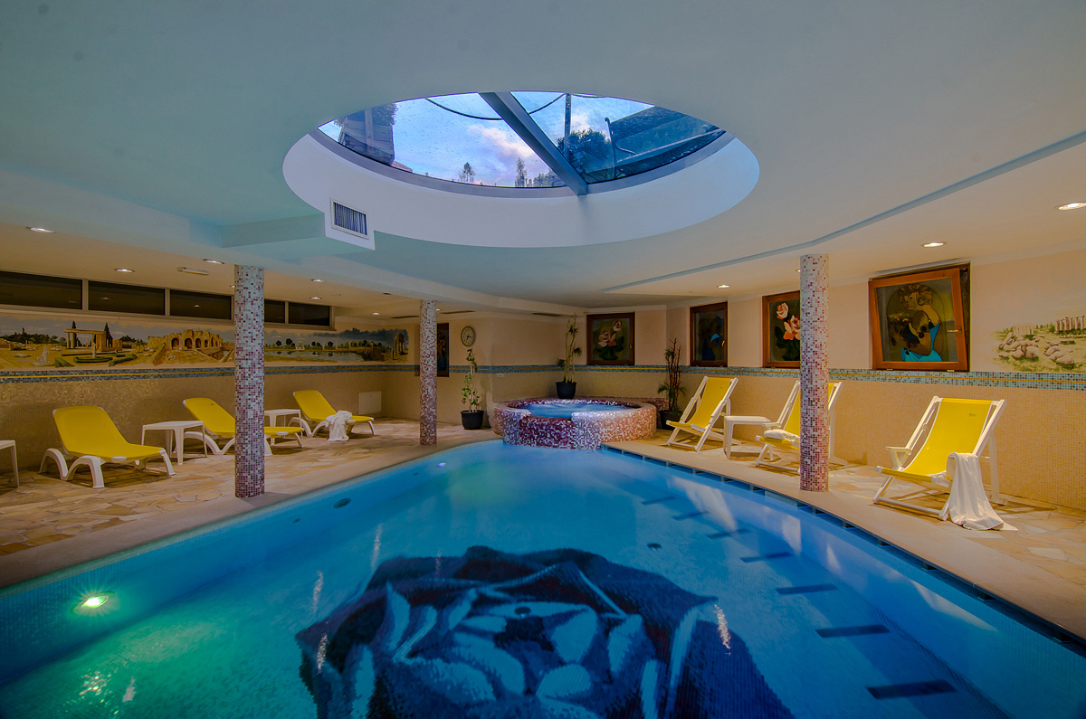 bazén* 30 m² s dětským bazénkem, protiproudem a lehátky, vířivka*, biosauna*, sauna*, pára*, ledová mlha*, multifunkční sprcha*, relaxační koutek* s lehátky a hudbou, malá posilovna* s TV, masáže*, kosmetické služby*, biliár, šipky, stolní fotbal; děti do nedovršených 16 let mají přístup pouze do bazénu