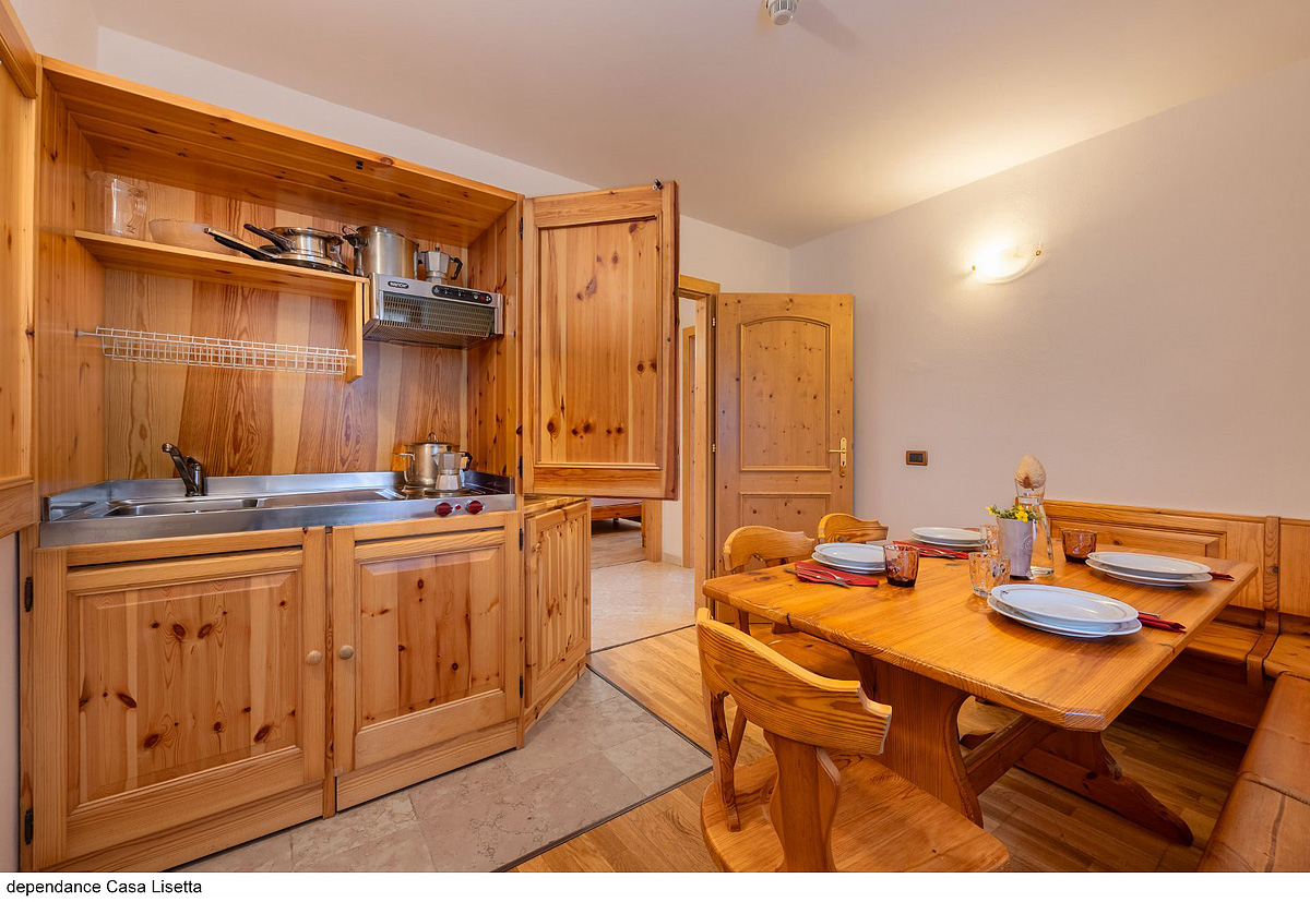 40 - 45 m² - 1 ložnice s manželskou postelí a palandou, obývací pokoj s kuchyňským koutem, sociální zařízení, balkon; apartmány se nachází v sousední Casa Lisetta