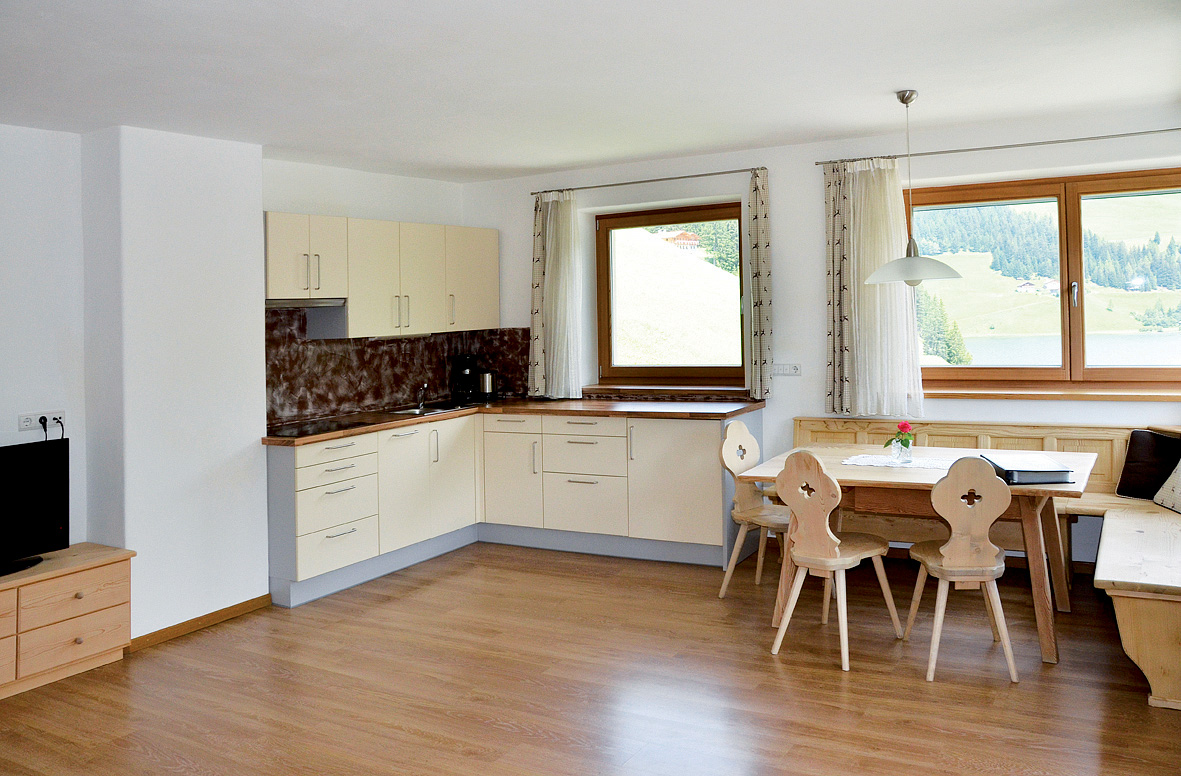 55 až 61 m² - 1 ložnice s manželskou postelí a rozkládacím křeslem na lůžko pro 1 osobu, obývací pokoj s kuchyňským koutem a rozkládacím gaučem na 2 samostatná lůžka, předsíň, sociální zařízení (apartmány situované v 1. patře i s vanou), balkon či předzahrádka