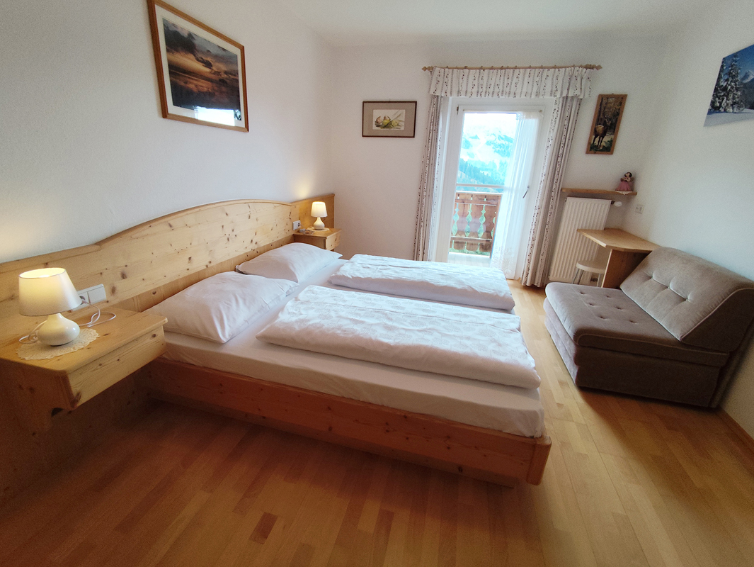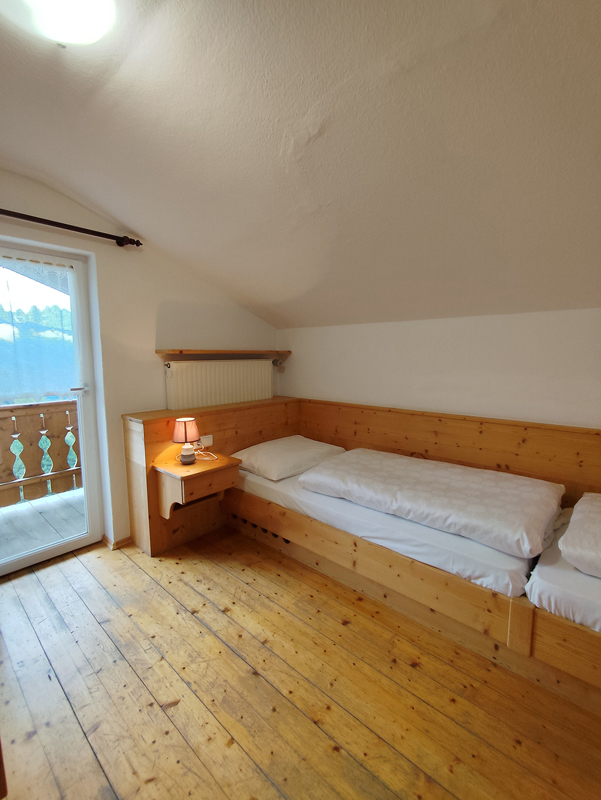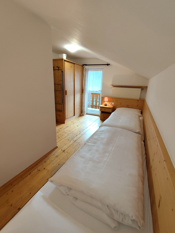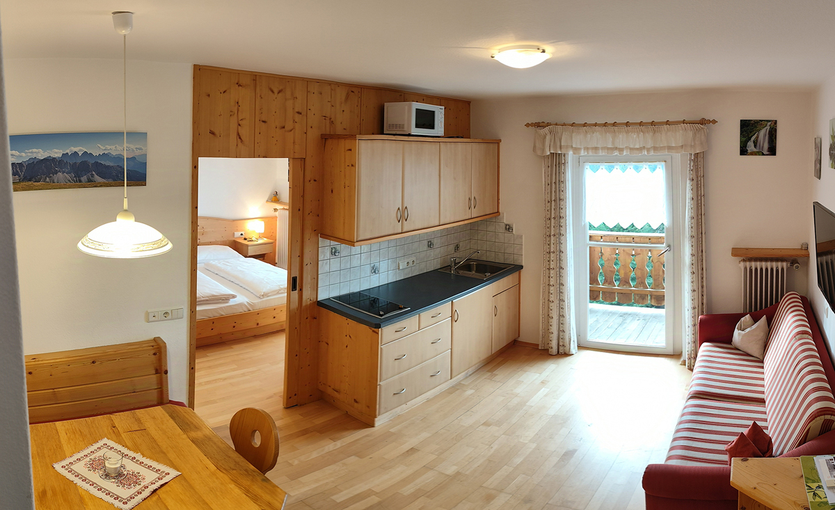 bilo Bergblick 2/3 A - ložnice s manželskou postelí, obývací pokoj s rozkládacím gaučem pro jednu osobu a kuchyňským koutem, sociální zařízení se sprchou, balkon