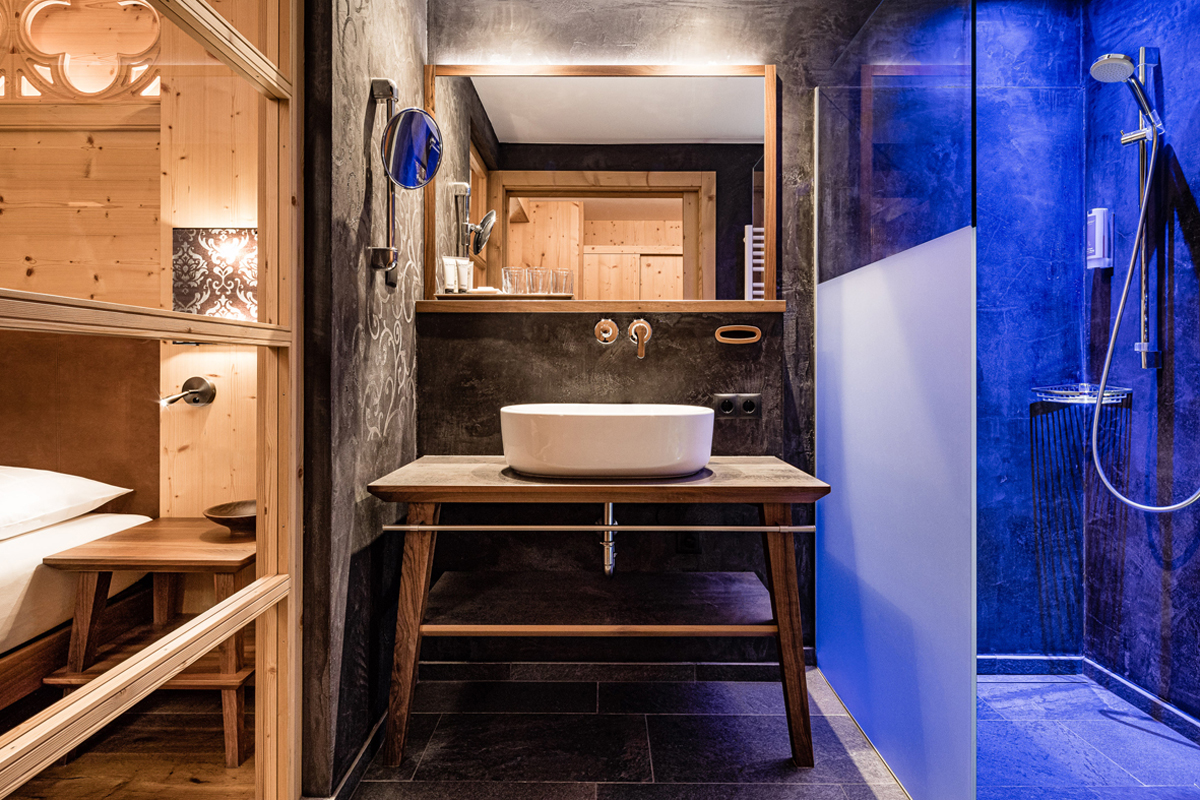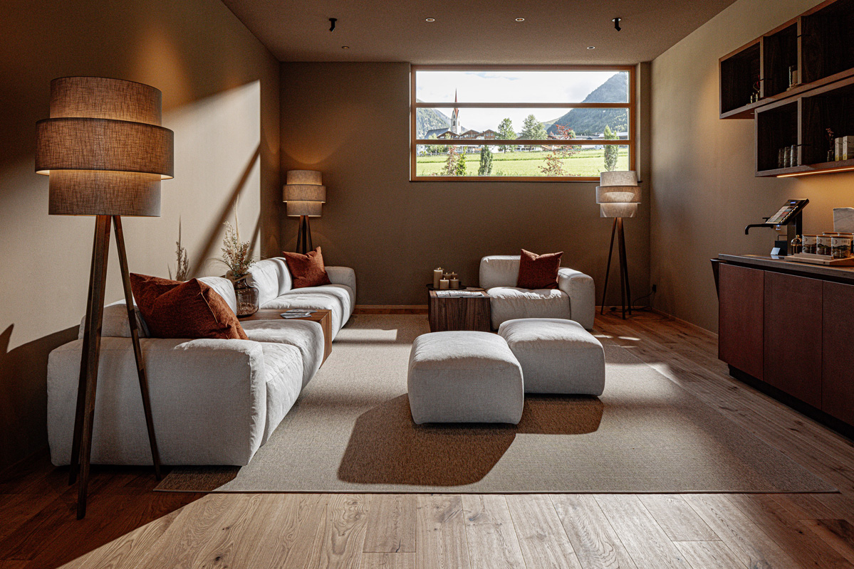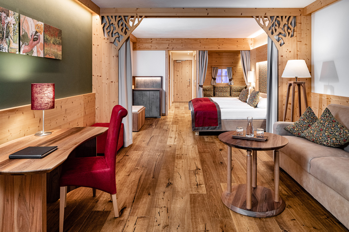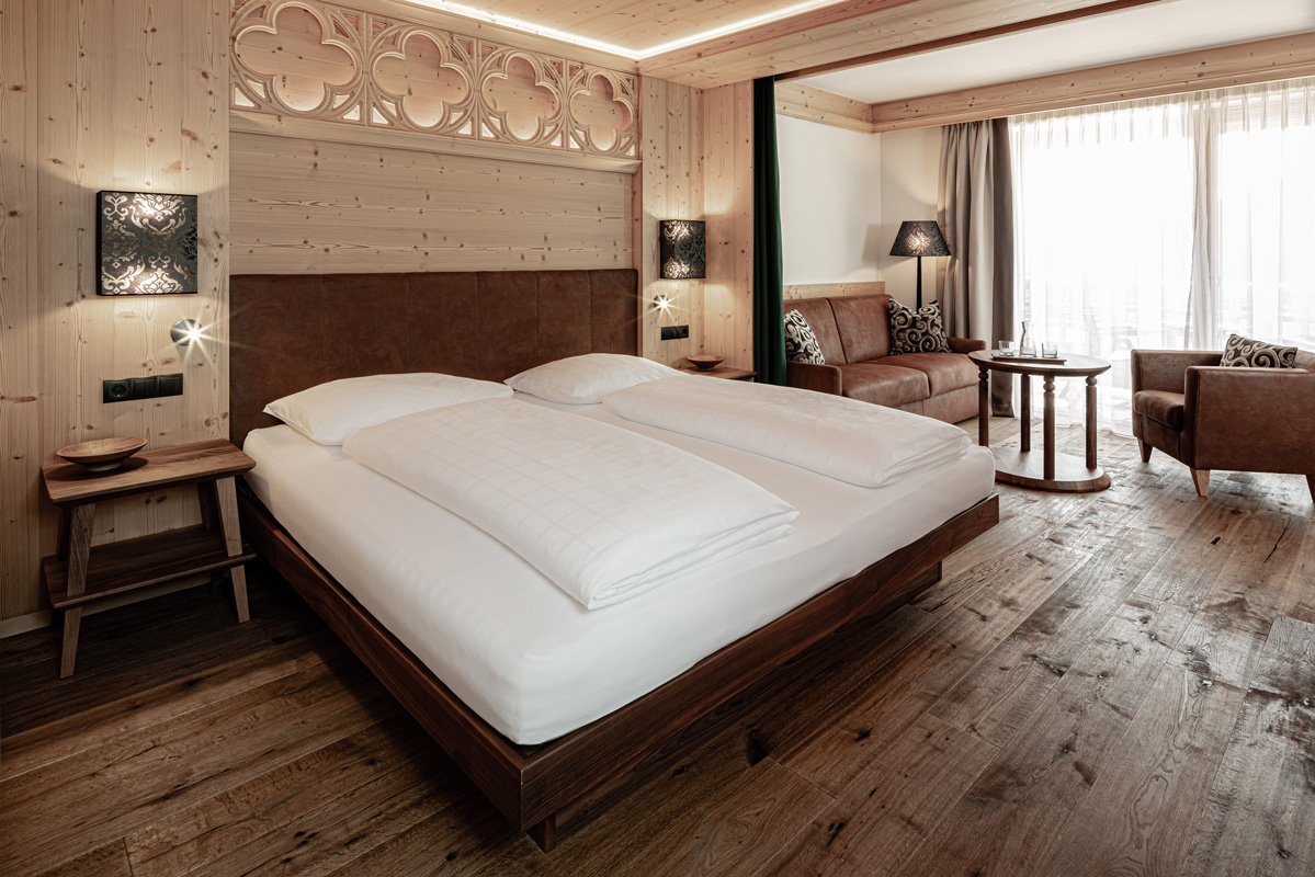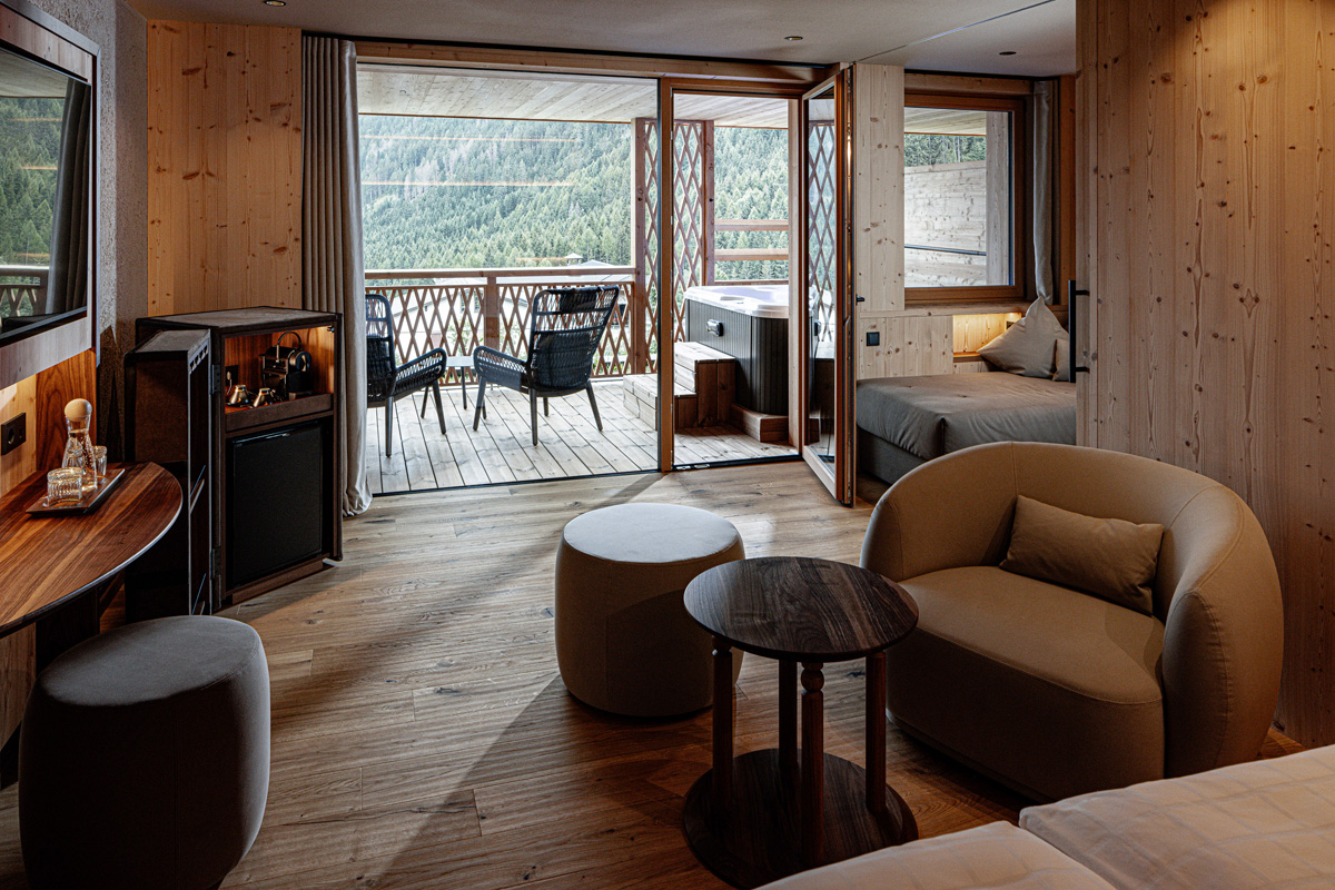 Suite Natura 2/3/4 sauna - 55 m² - pokoj s manželskou postelí a částečně oddělenou částí s pohodlným rozkládacím gaučem pro 2 osoby, prostorné sociální zařízení se sprchou a zabudovanou saunou, balkon s whirpool a výhledem na hory