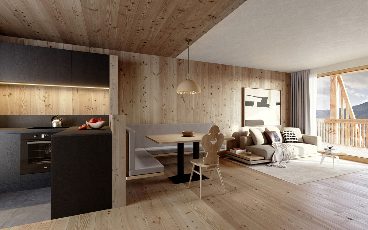 75 m² - 2 ložnice s manželskou postelí, obývací pokoj s kuchyňským koutem a rozkládacím gaučem pro 2 osoby, 2x sociální zařízení se sprchou, balkon 25 m; na balkoně privátní sauna, lehátko a křesílko