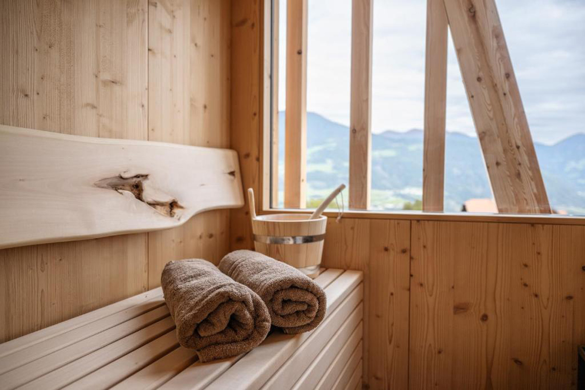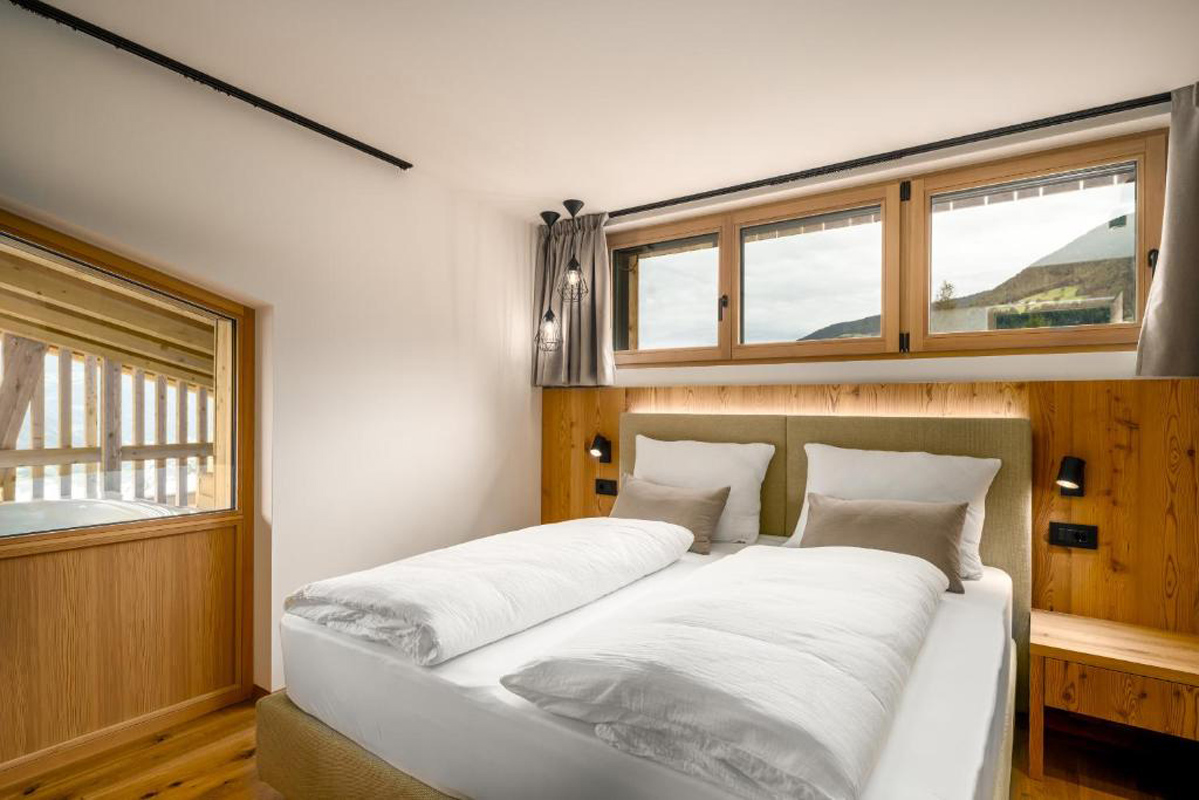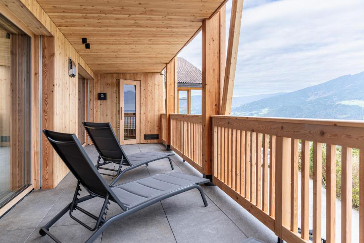 trilo 4+2 Premium - 75 m² - 2 ložnice s manželskou postelí, obývací pokoj s kuchyňským koutem a rozkládacím gaučem pro 2 osoby, 2x sociální zařízení se sprchou, balkon 25 m; na balkoně privátní sauna, lehátko a křesílko