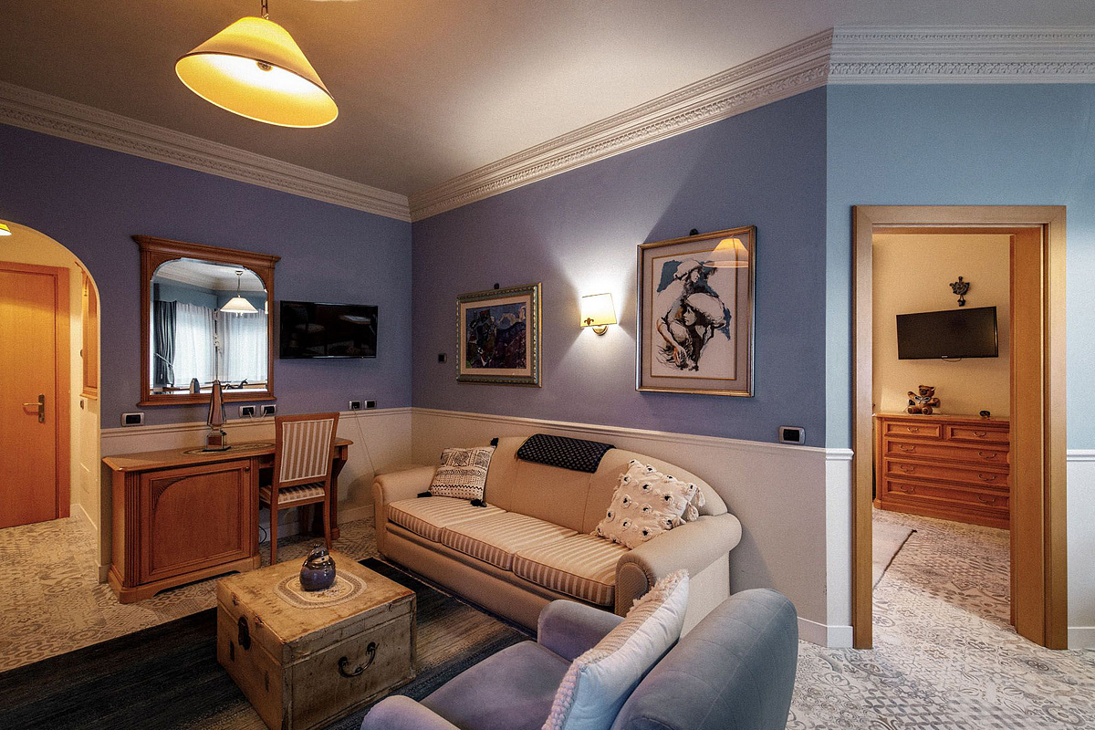 Grand Junior Suite 4 - 35 až 37 m² - pokoj s manželskou postelí, pokoj s rozkládacím gaučem pro 2 osoby, sociální zařízení s hydromasážní sprchou či vanou, balkon (u většiny pokojů 2x)