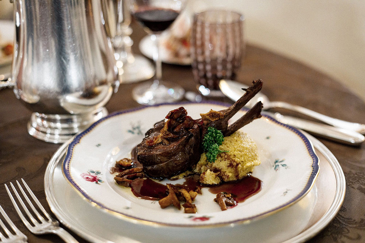 večeře - menu s výběrem ze 2 až 4 teplých předkrmů, 2 až 4 hlavních jídel s přílohou, servírovaný studený předkrm, servírovaný dezert, nápoje za poplatek