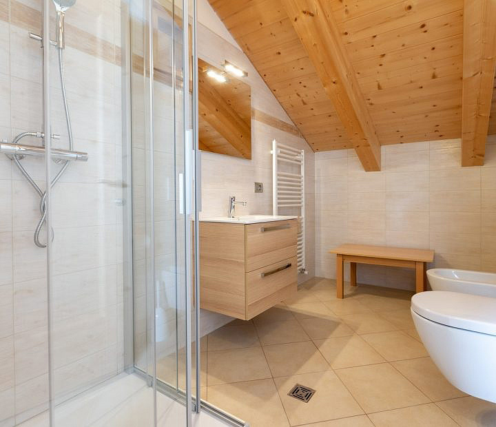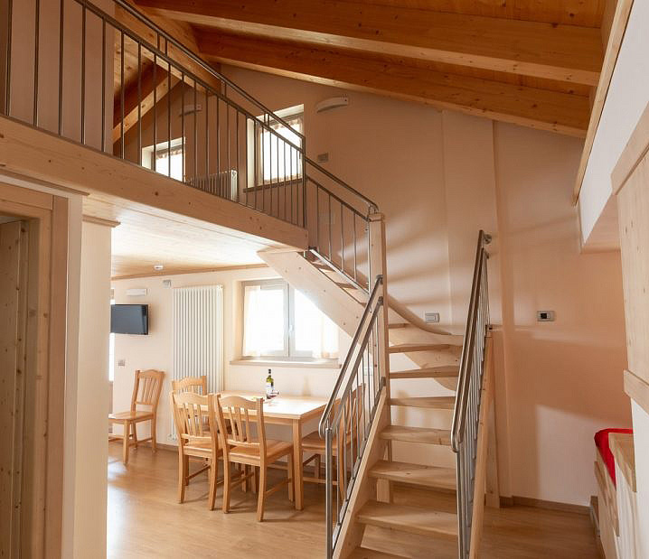 bilo 4+1 Superior - 65 m² - 1. podlaží apartmánu 1 ložnice s manželskou postelí, obývací pokoj s kuchyňským koutem a 1 samostatným lůžkem (pro dítě do nedovršených 12 let), sociální zařízení zpravidla se sprchou, 2 balkony (jeden s výhledem na sjezdovku a druhý s výhledem na město), v neuzavřeném patře rozkládací gauč pro 2 osoby, sociální zařízení zpravidla se sprchou