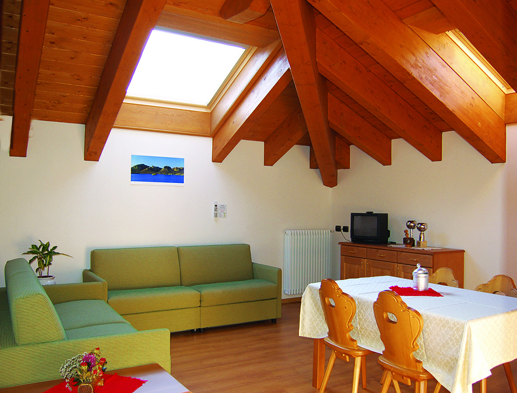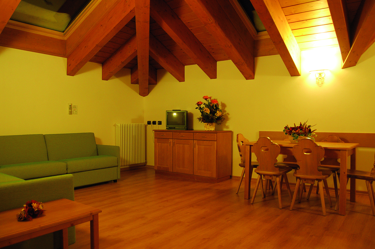 90 m² - 1. podlaží apartmánu: 1 ložnice s manželskou postelí, 1 ložnice s 1 samostatným lůžkem, obývací pokoj s kuchyňským koutem a rozkládacím gaučem pro 2 osoby, 1 sociální zařízení, balkon; 2. podlaží apartmánu: průchozí místnost s 1 samostatným lůžkem, 1 ložnice s manželskou postelí či 2 samostatnými lůžky