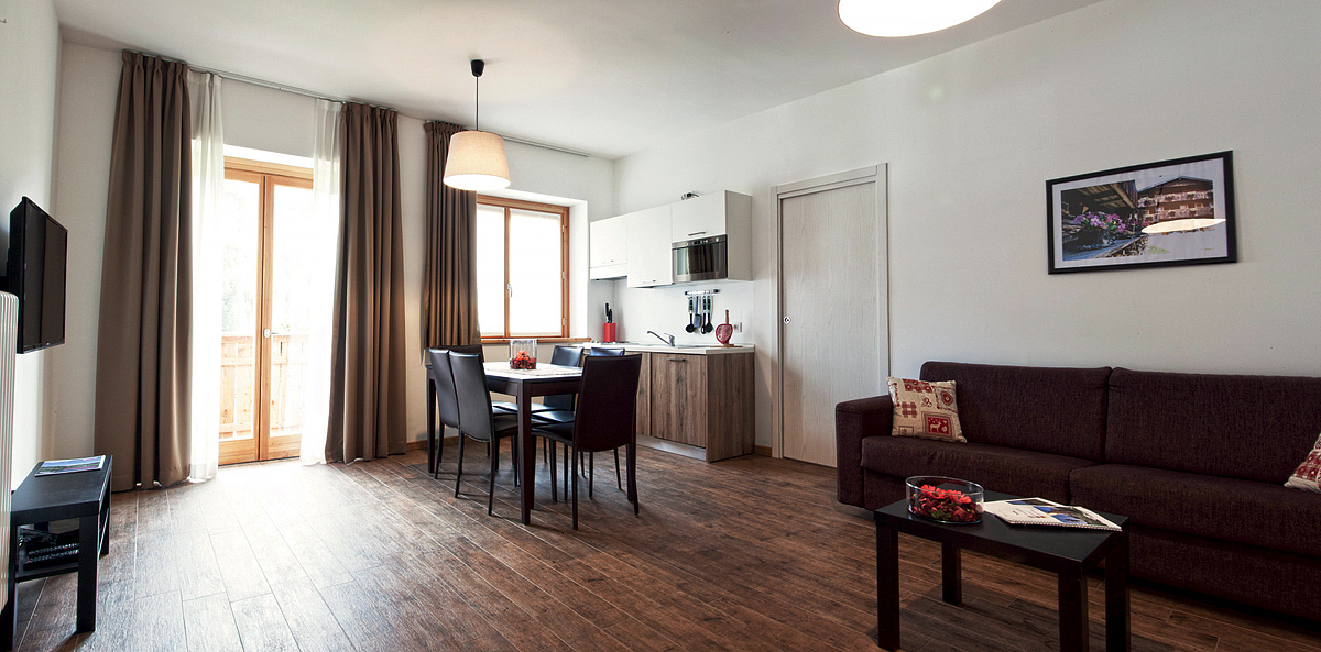 bilo 4 typ A - 54 m² - 1 ložnice s manželskou postelí, obývací pokoj s rozkládacím gaučem pro 2 osoby, samostatná kuchyňka, sociální zařízení; apartmán se nachází v přízemí