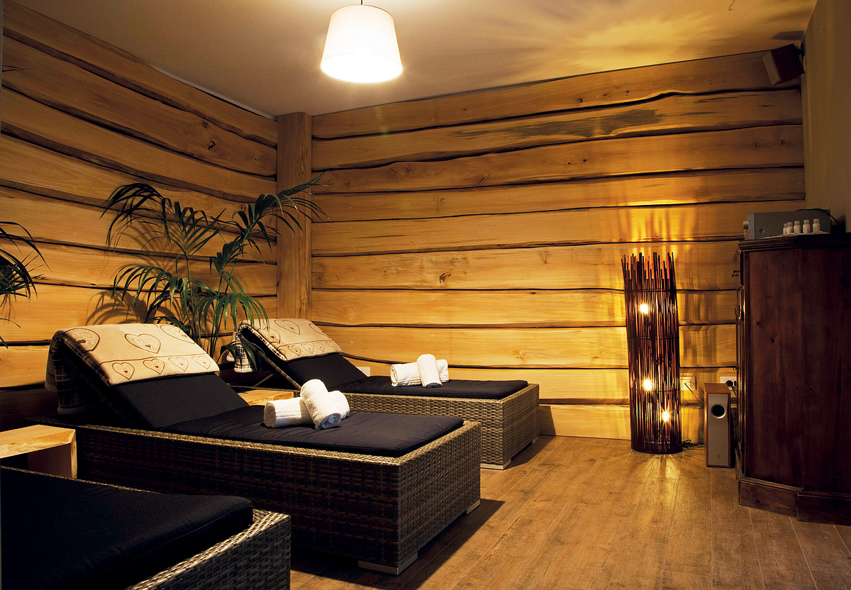soukromá wellness zóna* pro max. 5 osob (na vyžádání na max 3 hod.) - vířivka až pro 5 osob, finská sauna, relaxační koutek s lehátky; v rámci relaxačního centra je i sluneční terasa a jsou zdarma nabízeny bylinkové čaje
