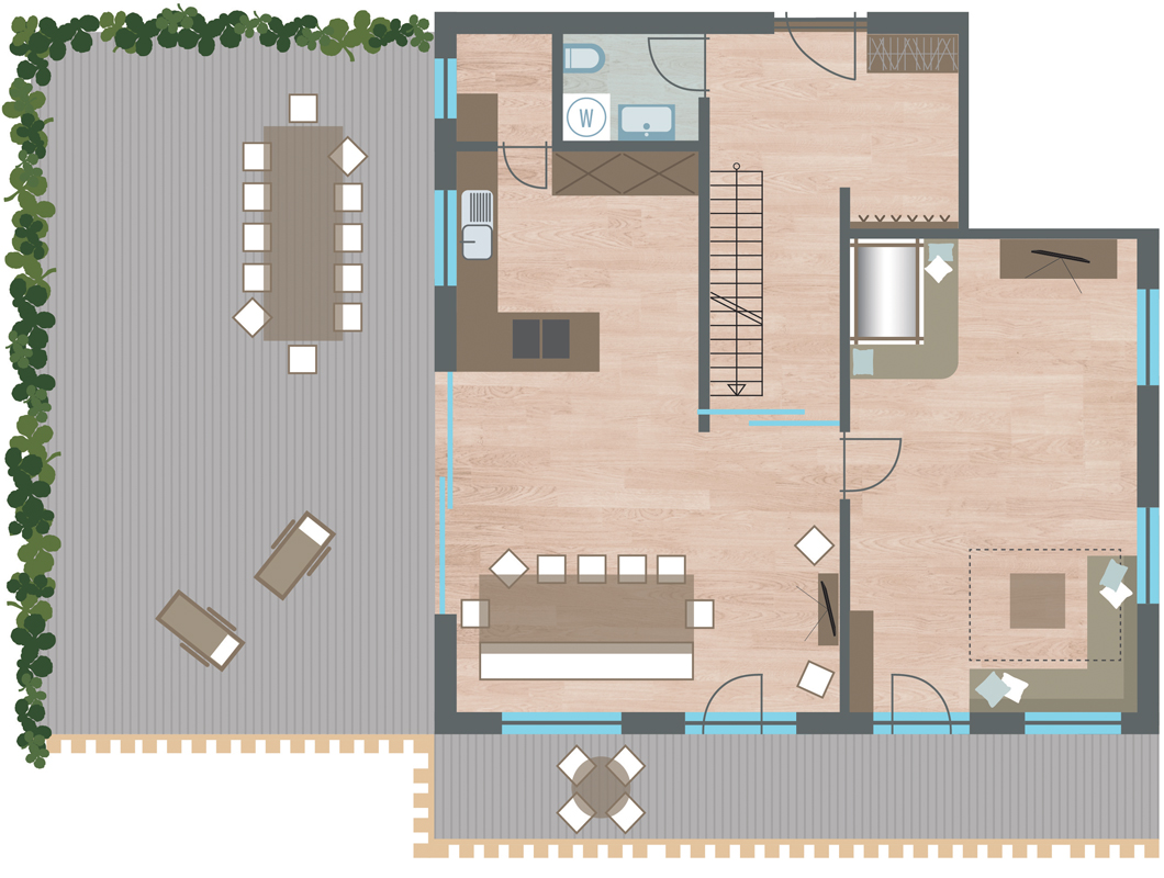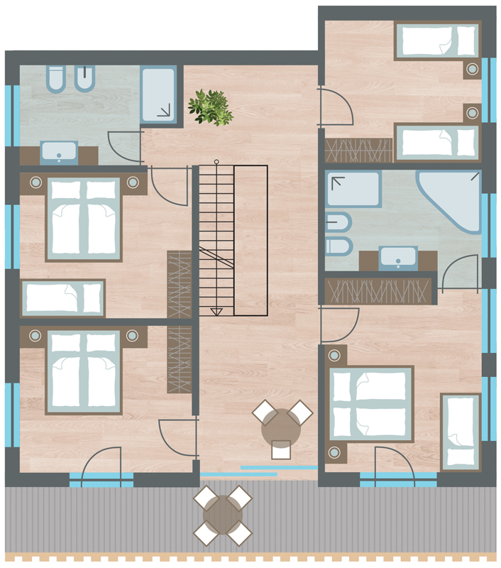 165 m² - 1. podlaží apartmánu: obývací pokoj s kuchyňským koutem a případně rozkládacím gaučem pro 1 osobu, 1 společenská místnost s krbem a rozkládacím gaučem pro 2 osoby, samostatné WC, velká terasa se vstupem na zahradu; 2. podlaží apartmánu: 1 ložnice s manželskou postelí, 2 ložnice s manželskou postelí a 1 samostatným lůžkem, 1 ložnice s 2 samostatnými lůžky, 1x sociální zařízení se sprchou, 1x sociální zařízení se sprchou a vanou, balkon