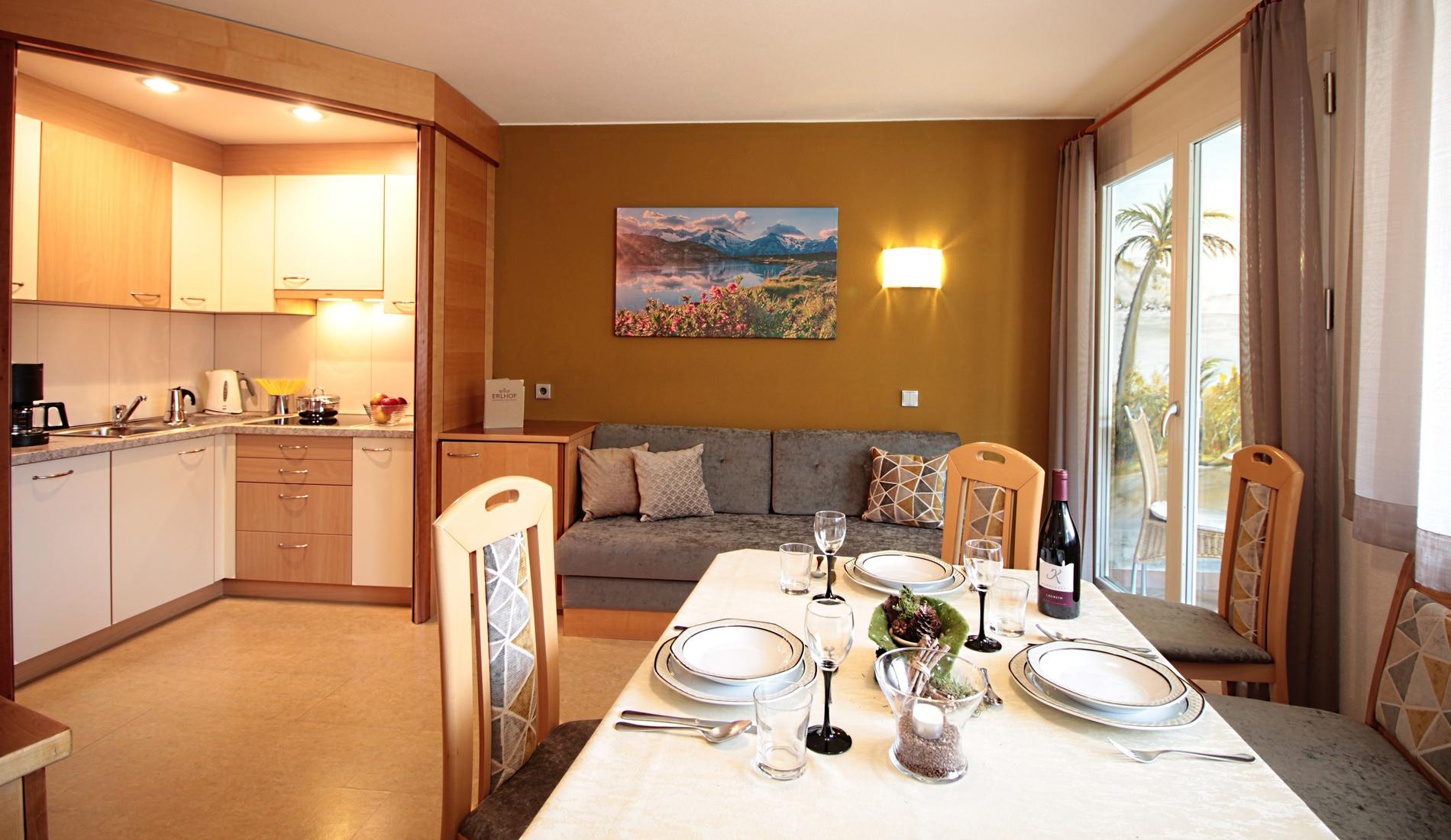 40 m² - 1 ložnice s manželskou postelí, obývací pokoj s kuchyňským koutem a rozkládacím gaučem pro 1 osobu, sociální zařízení se sprchou či vanou, balkon