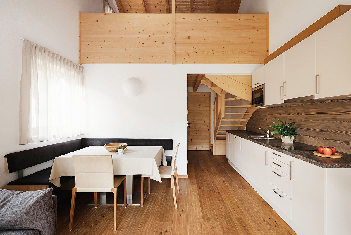 trilo 6 Larice - 55 m² - 1. podlaží apartmánu:1 ložnice s manželskou postelí a 1 samostatným lůžkem, obývací pokoj s kuchyňským koutem a rozkládacím gaučem pro 1 osobu, sociální zařízení, 2x balkon; 2. podlaží apartmánu (v podkroví): částečně uzavřená ložnice s manželskou postelí