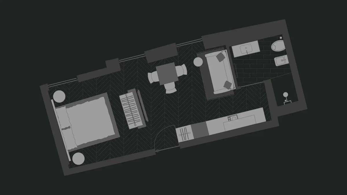 40 m² – obývací pokoj s kuchyňským koutem s částečně oddělenou manželskou postelí, sociální zařízení