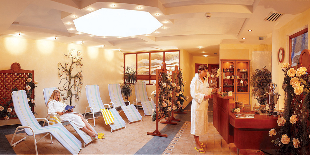 vířivka až pro 6 osob, sauna, aromatická pára, termárium, infrakabina, hydromasážní sprcha, multifunkční sprcha, vertikální solárium¹, relaxační koutek s lehátky, kneippův chodník, senná lázeň¹, masáže¹, kosmetické služby¹, posilovna, kluziště, curling¹